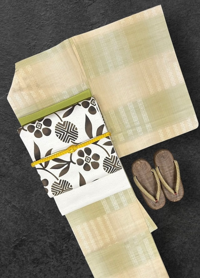 花織のような細かい地紋が施されたうすめの鳥の子色の地に、薄萌葱色の縦縞が優雅な印象を与えるお召しです。ハリのあるなめらかな地は、着心地も非常に良く、あなたの着物ライフをより華やかに演出します。 インスタやっております!お時間がございましたらご覧くださいませ。(@hyoutandou.kimono ) 商品は店舗にてご覧いただけます。 https://hyoutandou.tokyo 【サイズ】 ◯肩身丈 168cm ◯裄丈 69cm ◯前幅 24.5 cm ◯後幅 30 cm ◯袖丈 49cm ◯袖幅 34.5cm 【折代】 裄出し[ 袖側 3.5cm 身頃側 2.5cm ] 身丈出し [ 内揚 5cm 袖丈出し 5cm ] 実際に出る寸法等、お直しについては専門店にてご相談下さい。 【素材】 正絹 【使用状況】 新品または新品同様の大変良い状態です 【おすすめ季節】 袷通年 【注意事項】 ・商品のお色目は出来る限り現物に近づけて調整しておりますが、ご覧いただいているモニターの環境等によって多少の差異が生じます。表記の和色を「和色大辞典」https://www.colordic.org/w/にてご確認頂けますようお願い申し上げます。 ・着物の帯の寸法は一点ずつスタッフの手で測っております。生地の性質や測り方で若干の誤差が出る場合がございます。どうぞご了承くださいませ。 ・商品到着後、一週間以内に記載されていない欠陥がございましたら、ご着用前のみご返金・ご返品を承ります。 ・基本的に商品の殆どが中古・新古のお品となります。保管時のにおいがある場合がございます。お気になさるお客様のご購入はお控え頂けますようお願い申し上げます。 ・出品商品は店舗にて販売してる場合もございます。突然商品の掲載を取りやめる場合がございます。予めご了承ください。