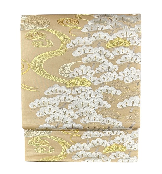 袋帯 刺繍 明るめの白茶色の地 豪華な松と流水文様 長さ 443㎝ Q4867
