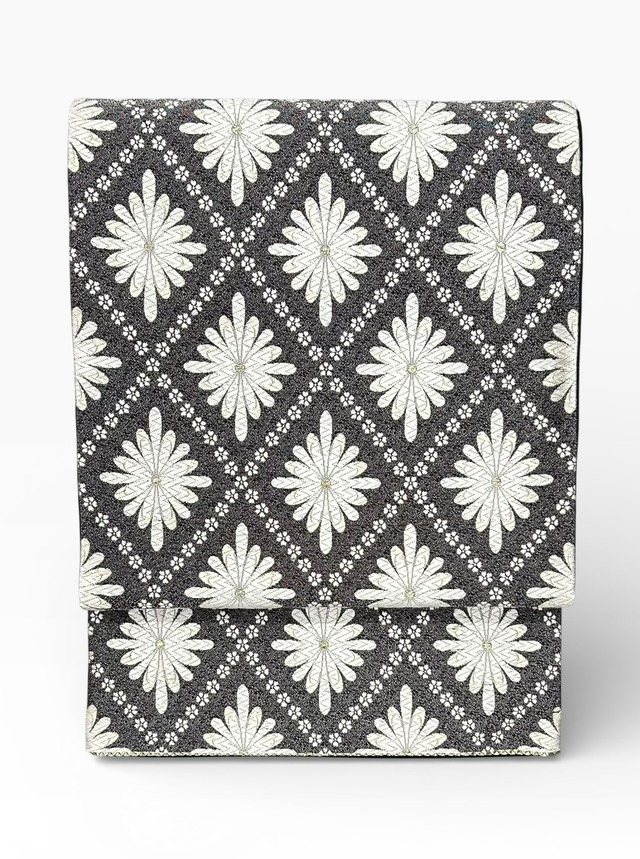 袋帯 銀糸の混ざった黒地 白練色の花菱文 長さ 440㎝ Q6321