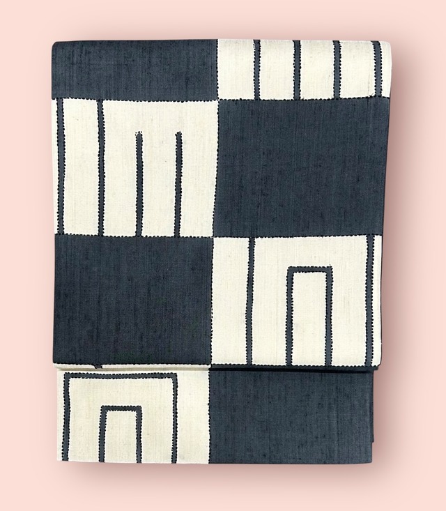 袋帯 象牙色 煤色の長方形の格子柄 長さ 474cm シンプル Q5261