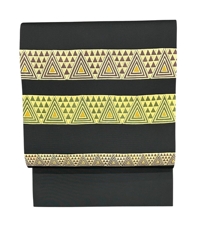 八寸名古屋帯 黒橡色×鳥の子色と黒橡色×白鼠色 絣模様のような織柄 長さ 371㎝ Q6033