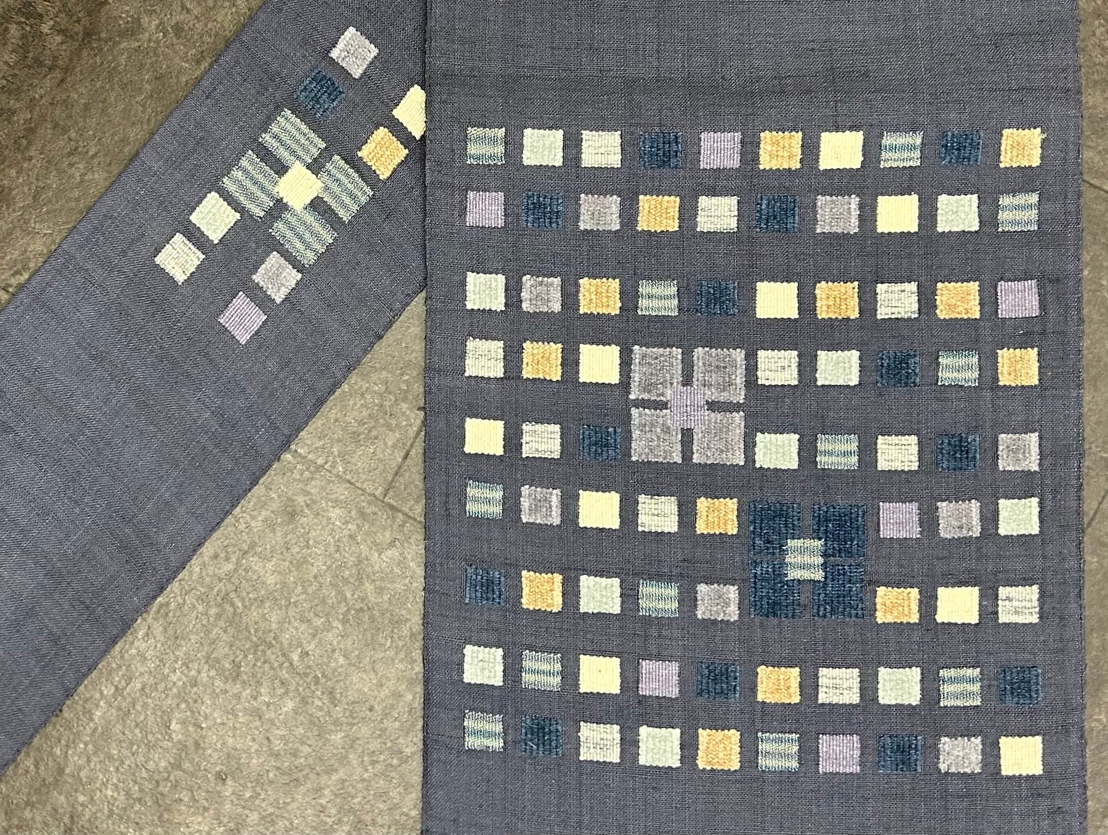 うすい青褐色のしっかりとした厚手の地に、ブルー系の同系色や生成り、榛色等を四角くモールで織り込んだ柄が可愛らしい、真綿紬の八寸の名古屋帯です。