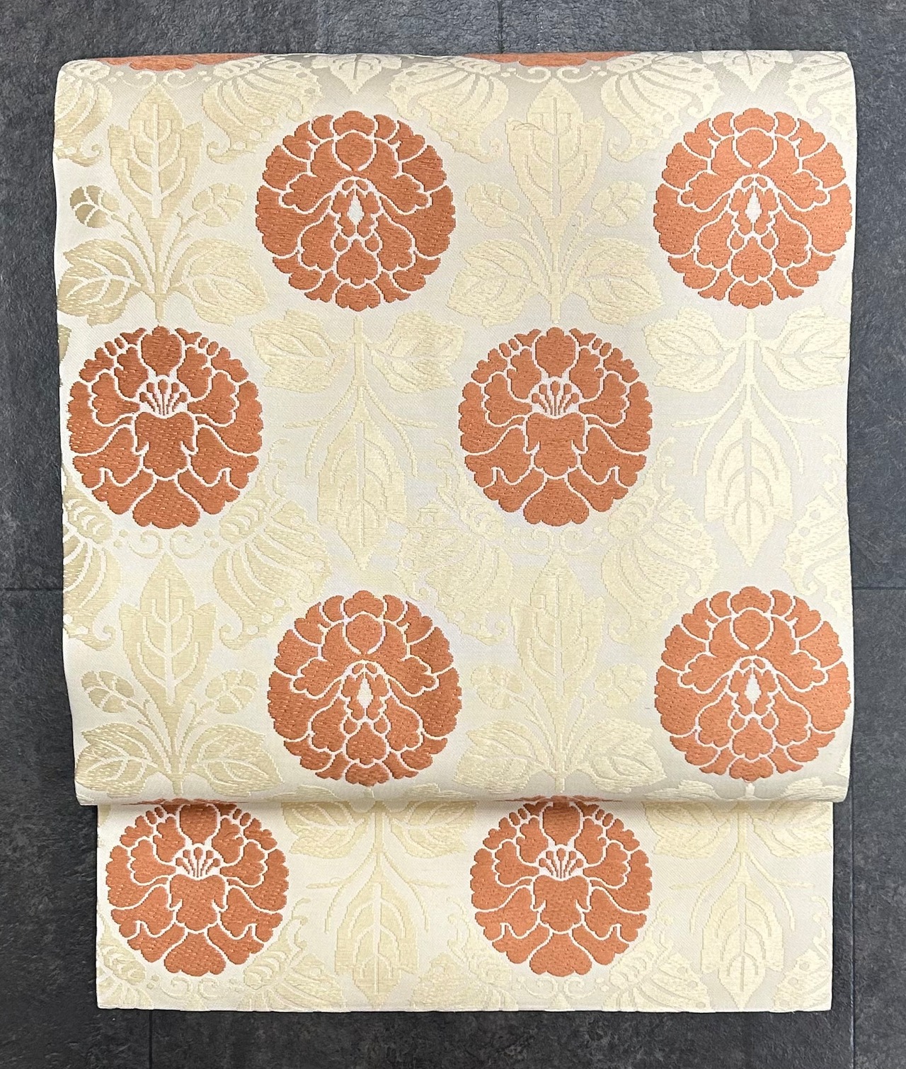 名古屋帯 俵屋 人間国宝 喜多川平郎 鳥の子色の地 東雲色の丸い花と鳥の子色の葉 上品 長さ370 ㎝ Q4763