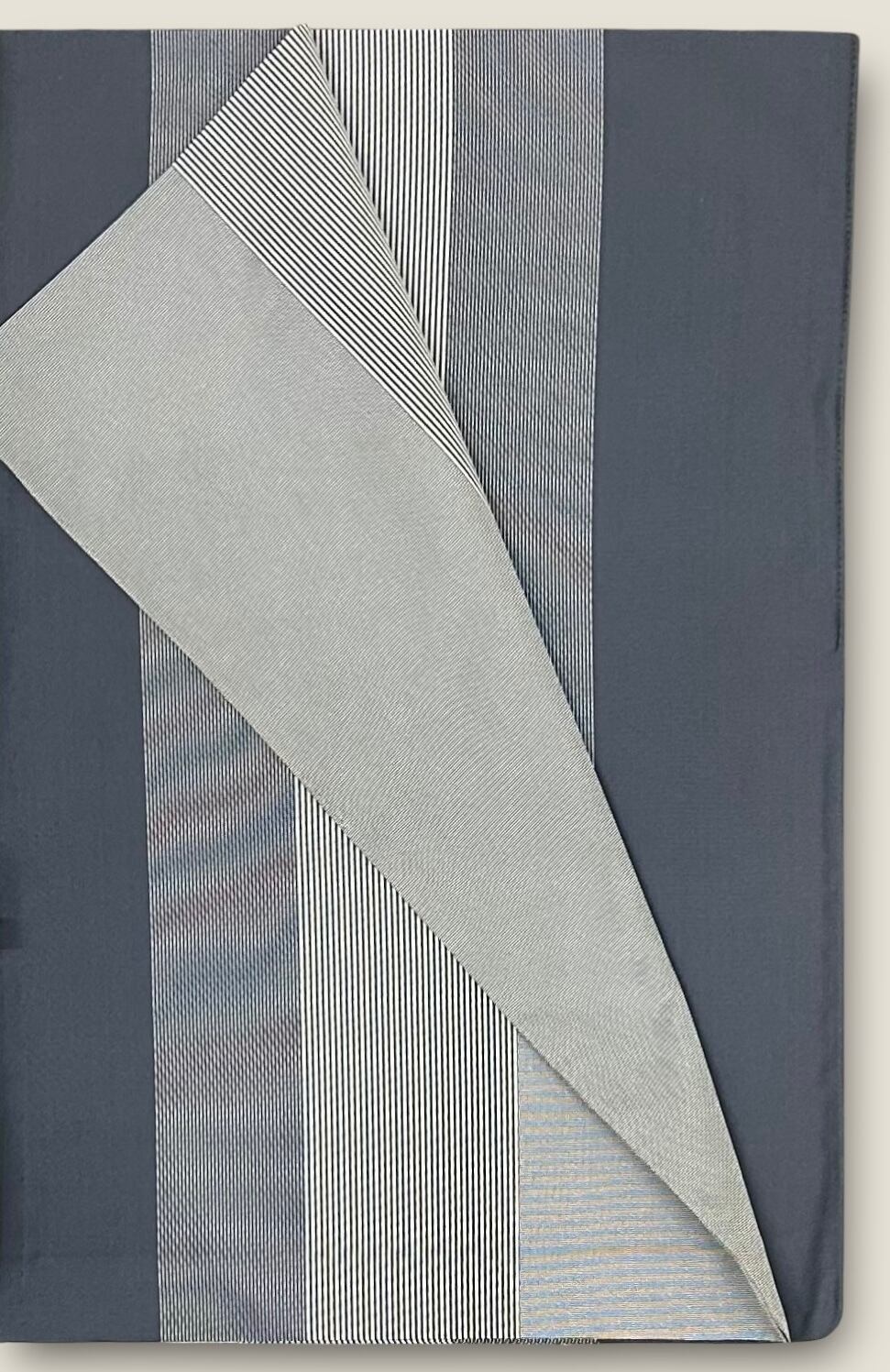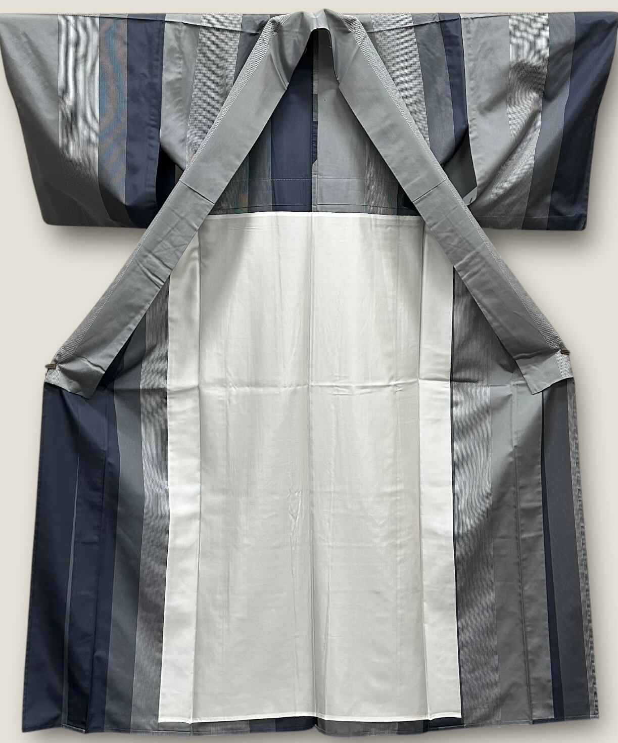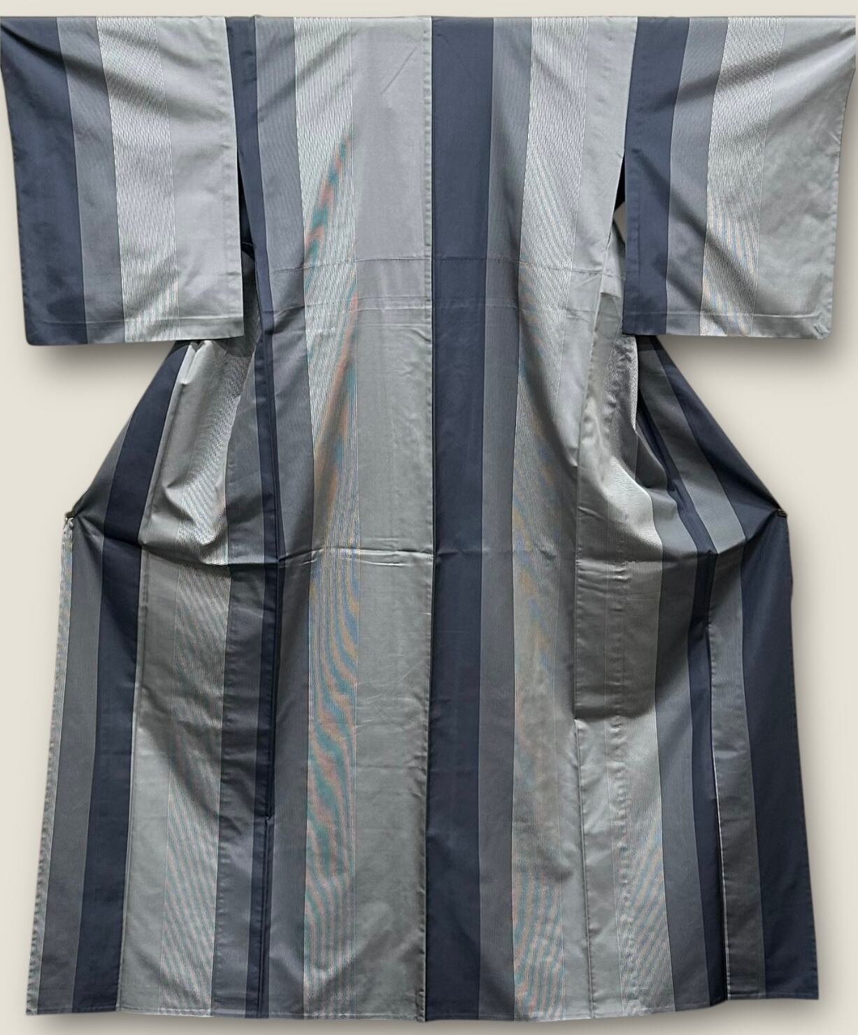 暗めの青褐色×薄鈍色の 縦縞と とても細かい格子柄 スッキリ&シャープな印象のお着物です。