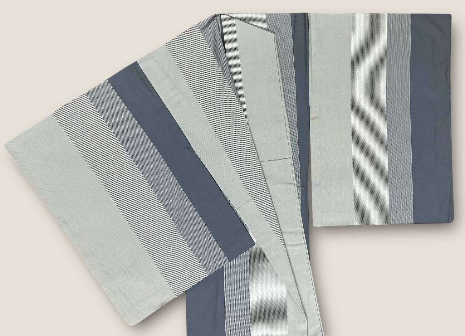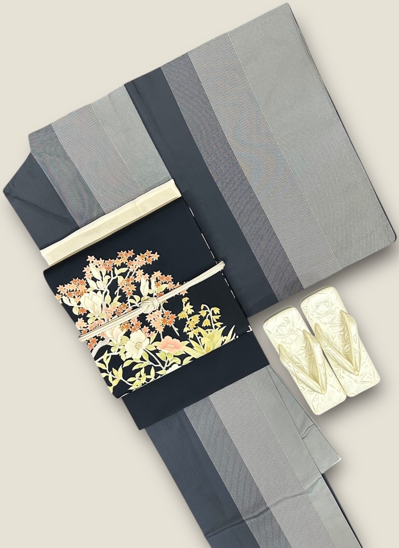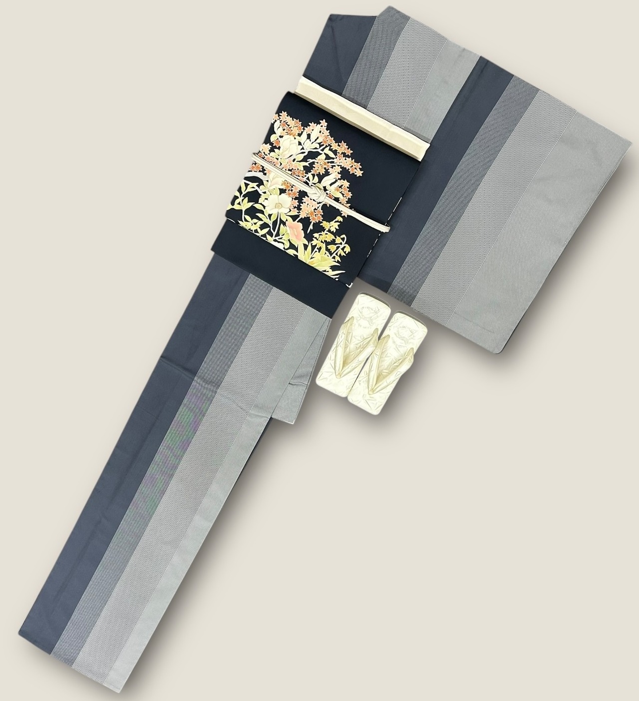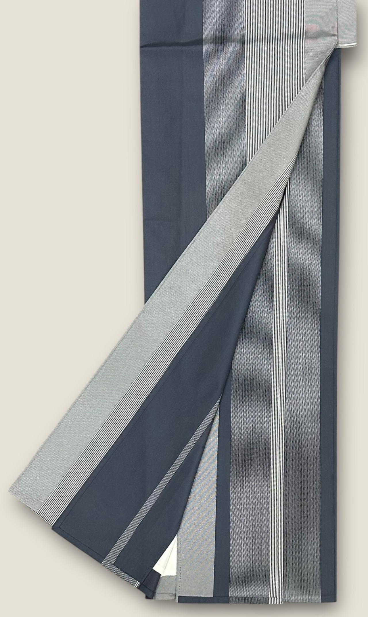 暗めの青褐色×薄鈍色の 縦縞と とても細かい格子柄 スッキリ&シャープな印象のお着物です。