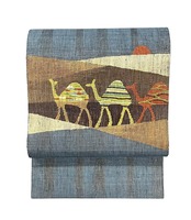八寸名古屋帯 未使用 紫が混ざったような薄縹色などに茶系の地 趣あるラクダのお太鼓柄 長さ 365㎝ Q4382