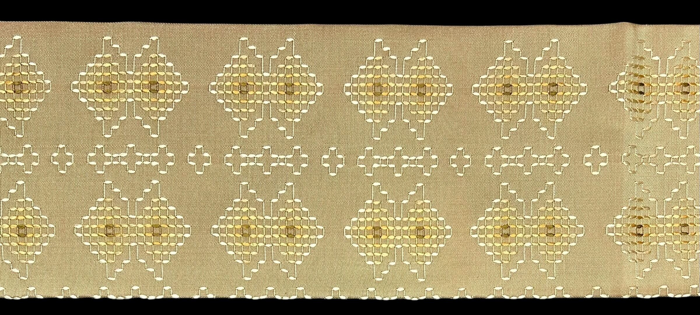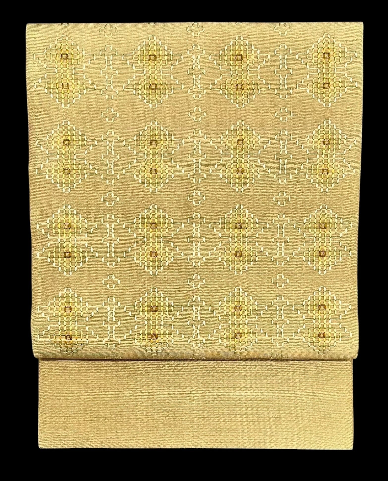 美しい薄い黄土色のこの名古屋帯は、同色系の濃淡を巧みに組み合わせたティーバナ花織が特徴です。可愛く上品なデザインは、さまざまな着物スタイルに合わせやすく、光沢があり少々厚みのある地で程よいハリのあるお品です。