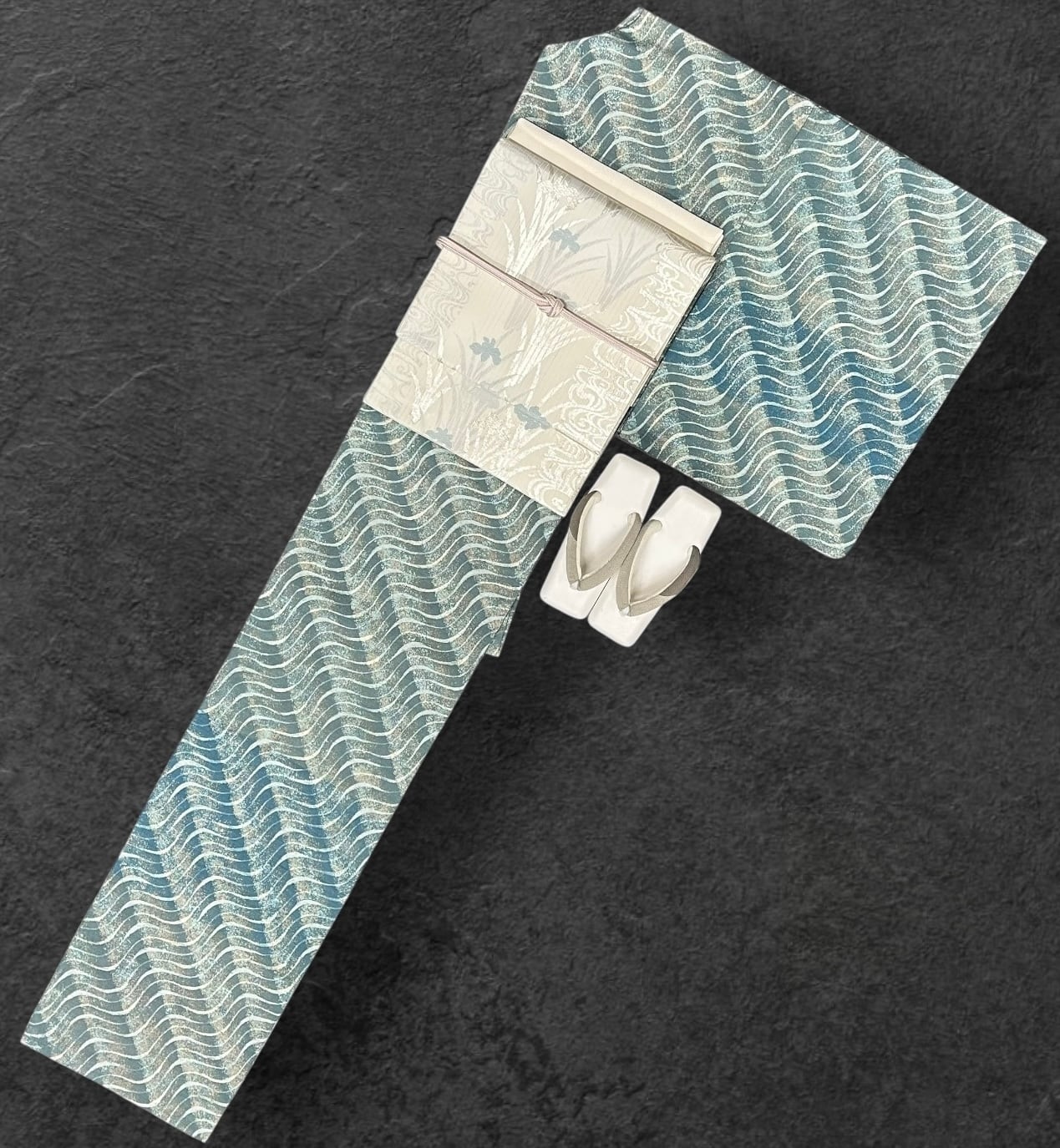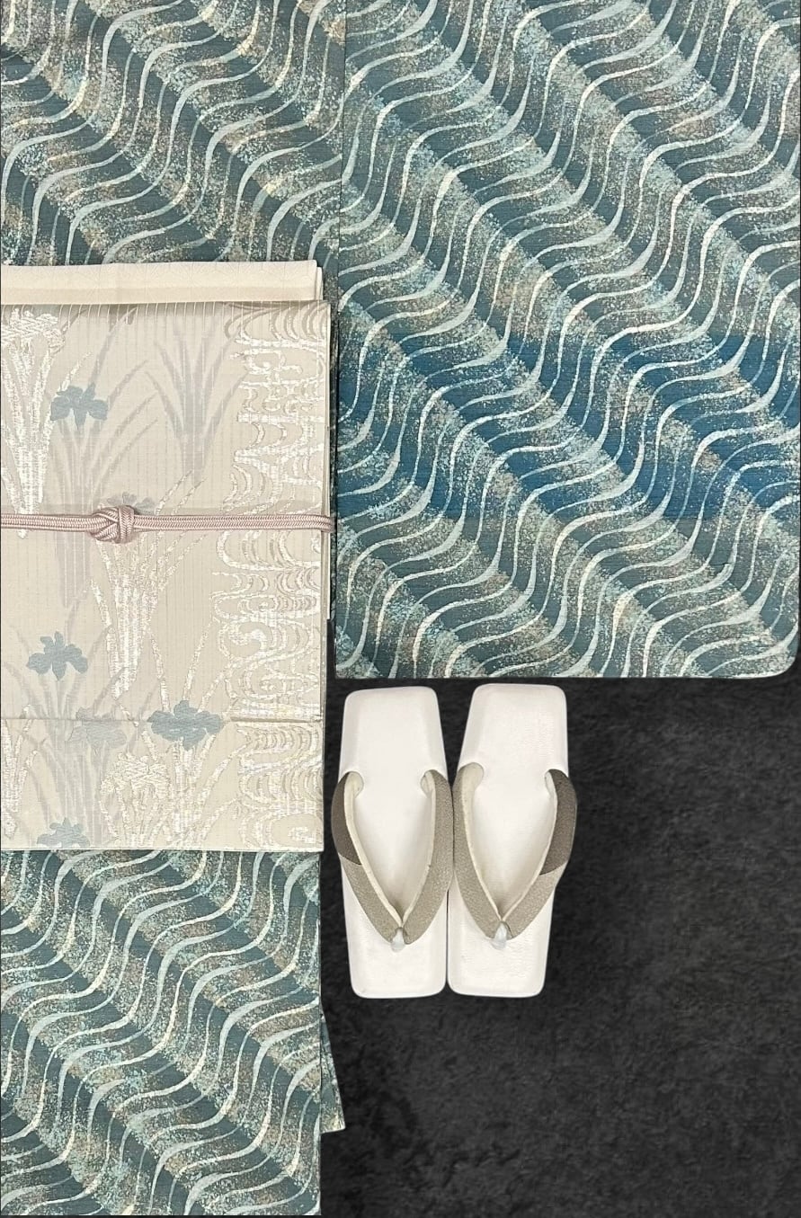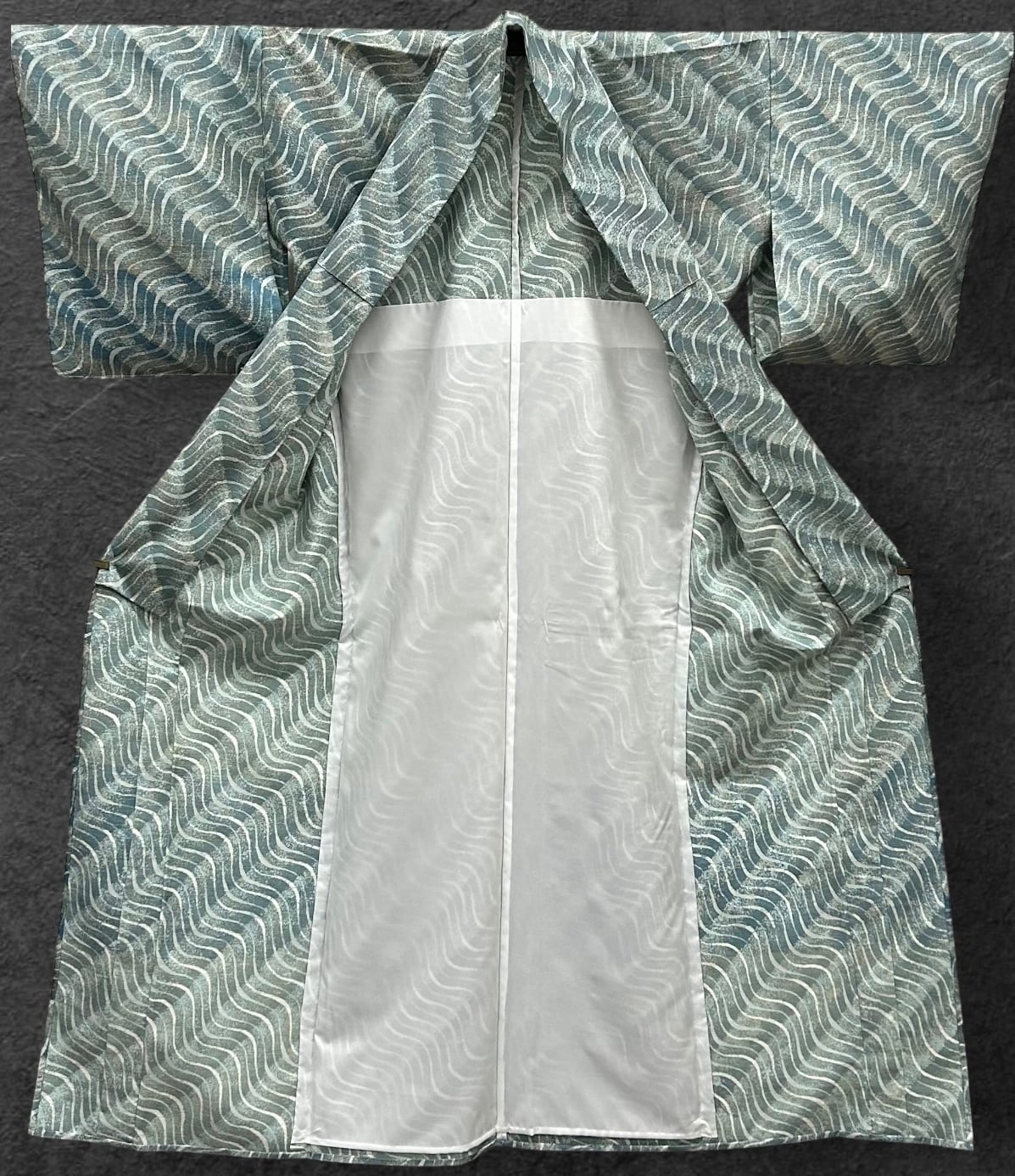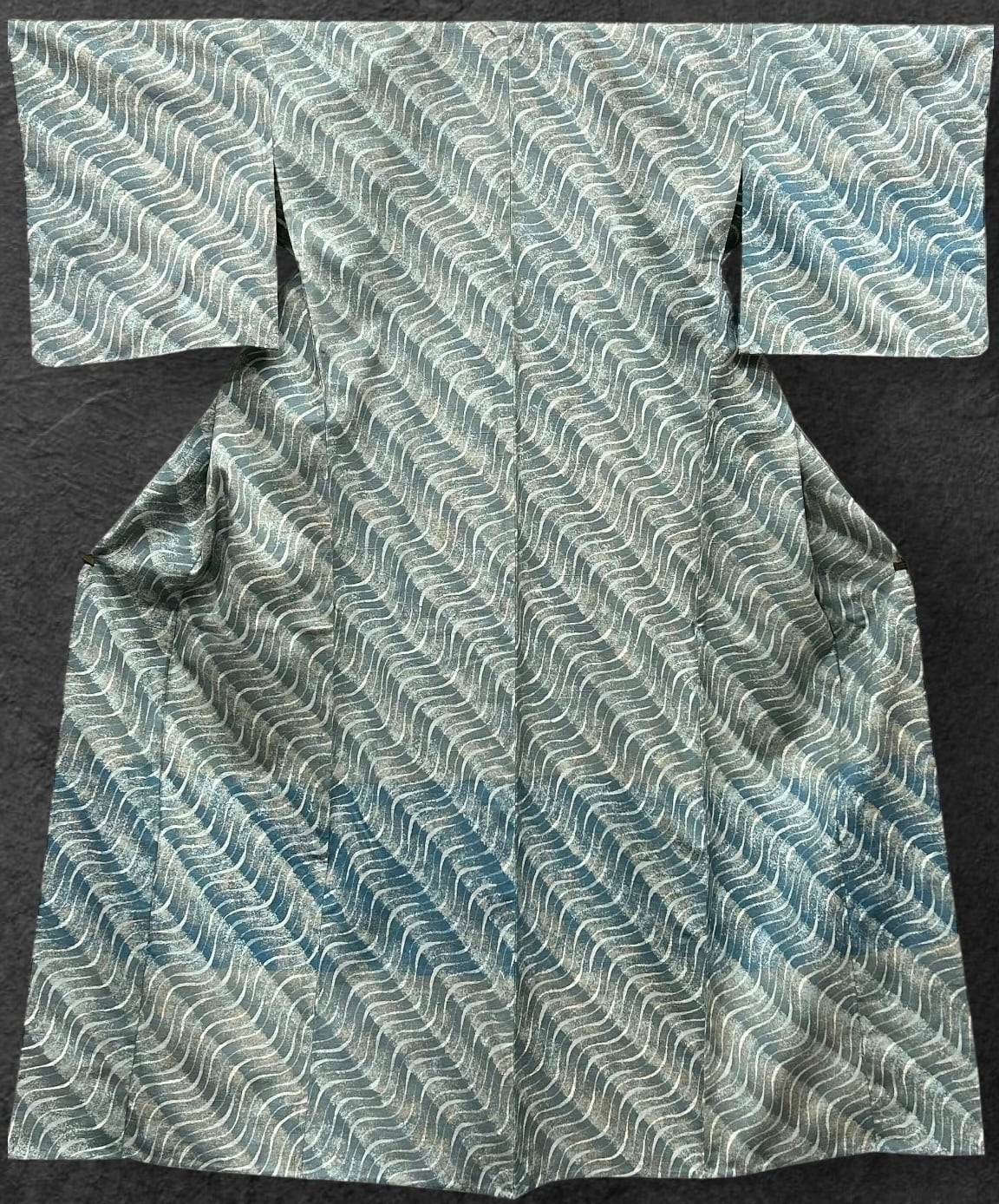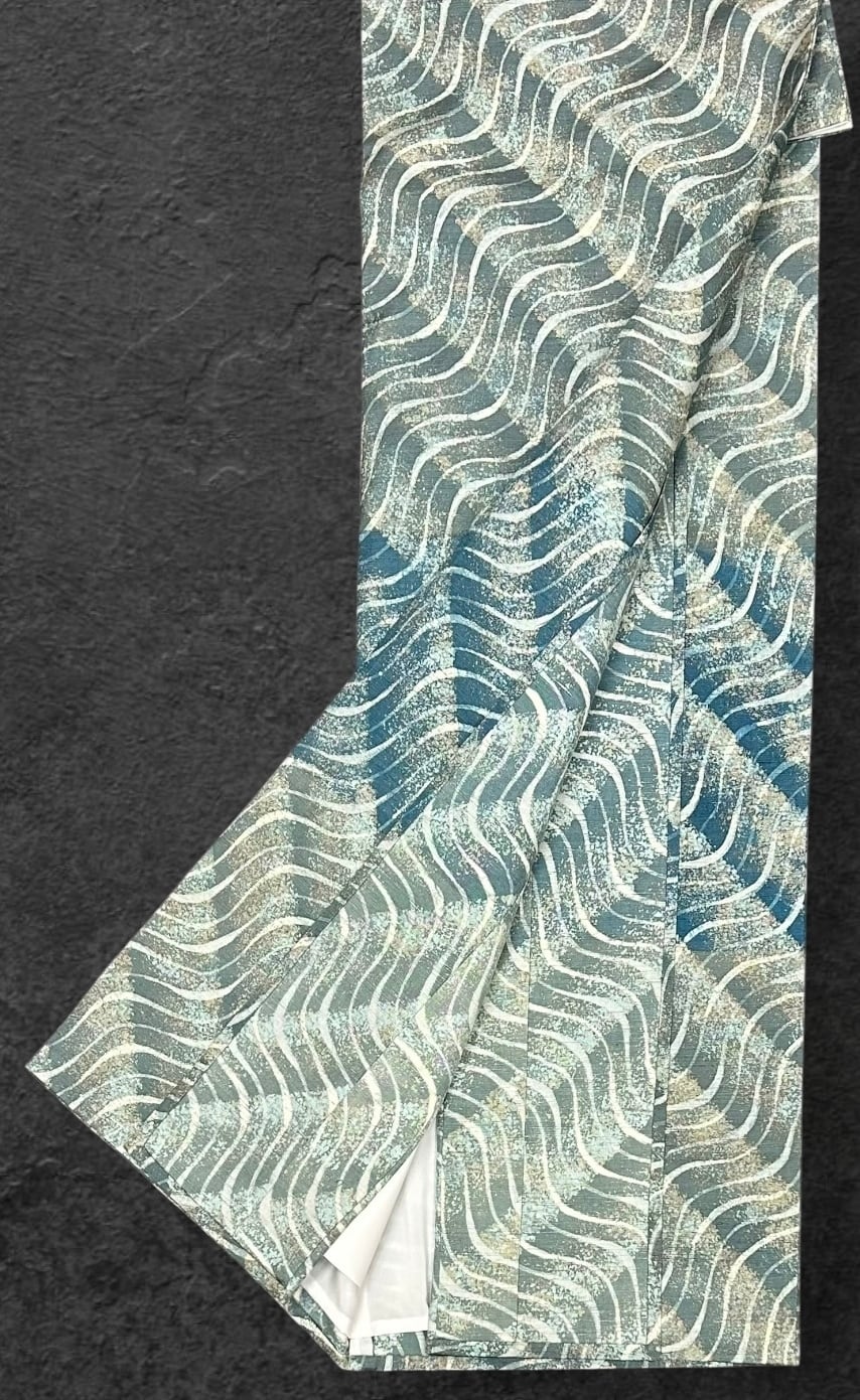 くすんだ錆浅葱~青碧(付下げの部分)のグラデーションの紬地に、白波のような柄と浅縹色と榛色でろうけつ染めのような柄が、斜めに交差して全体に広がる柄が個性的で波路というお題にぴったりな市河恭子作の作家物お品です。