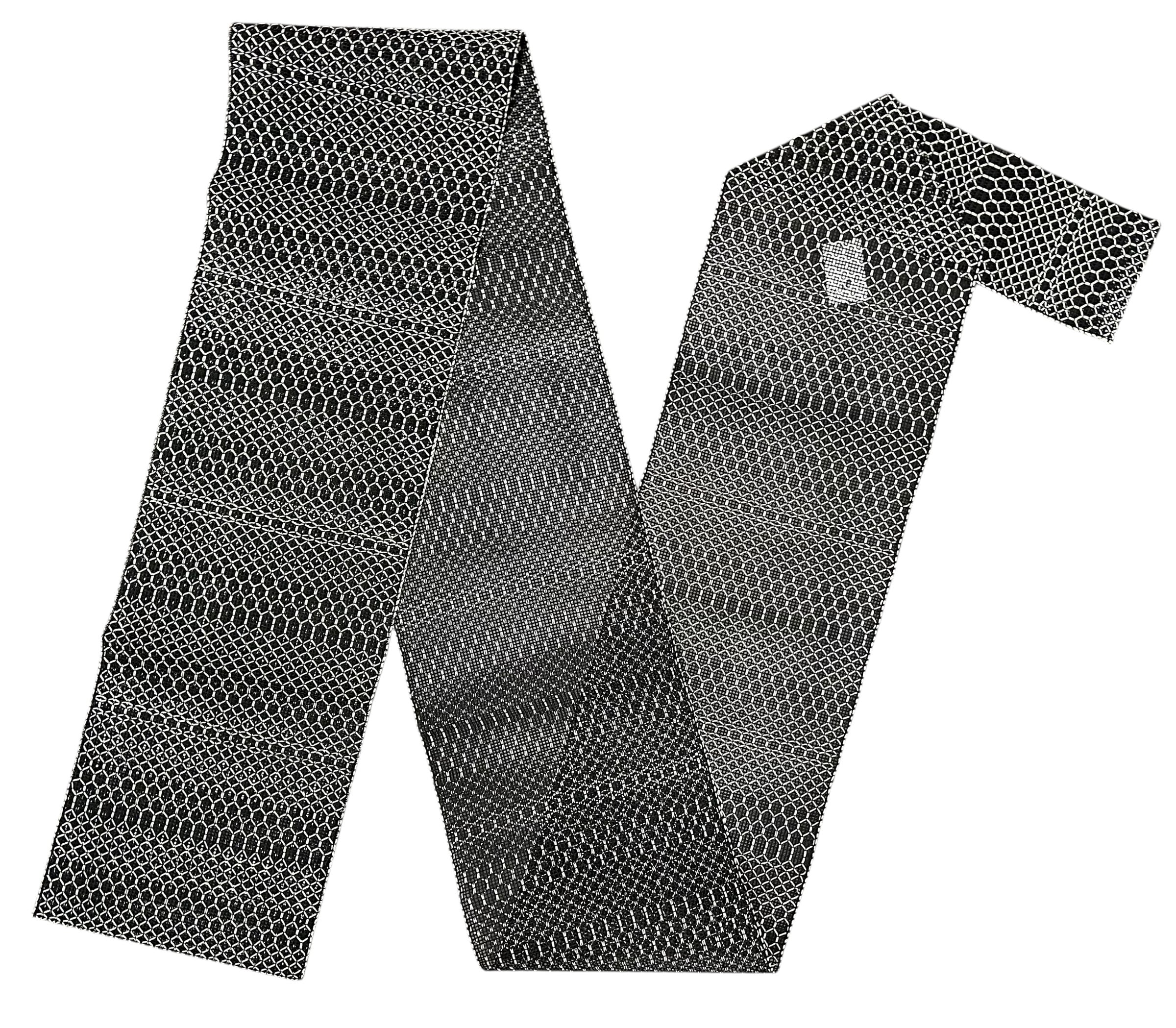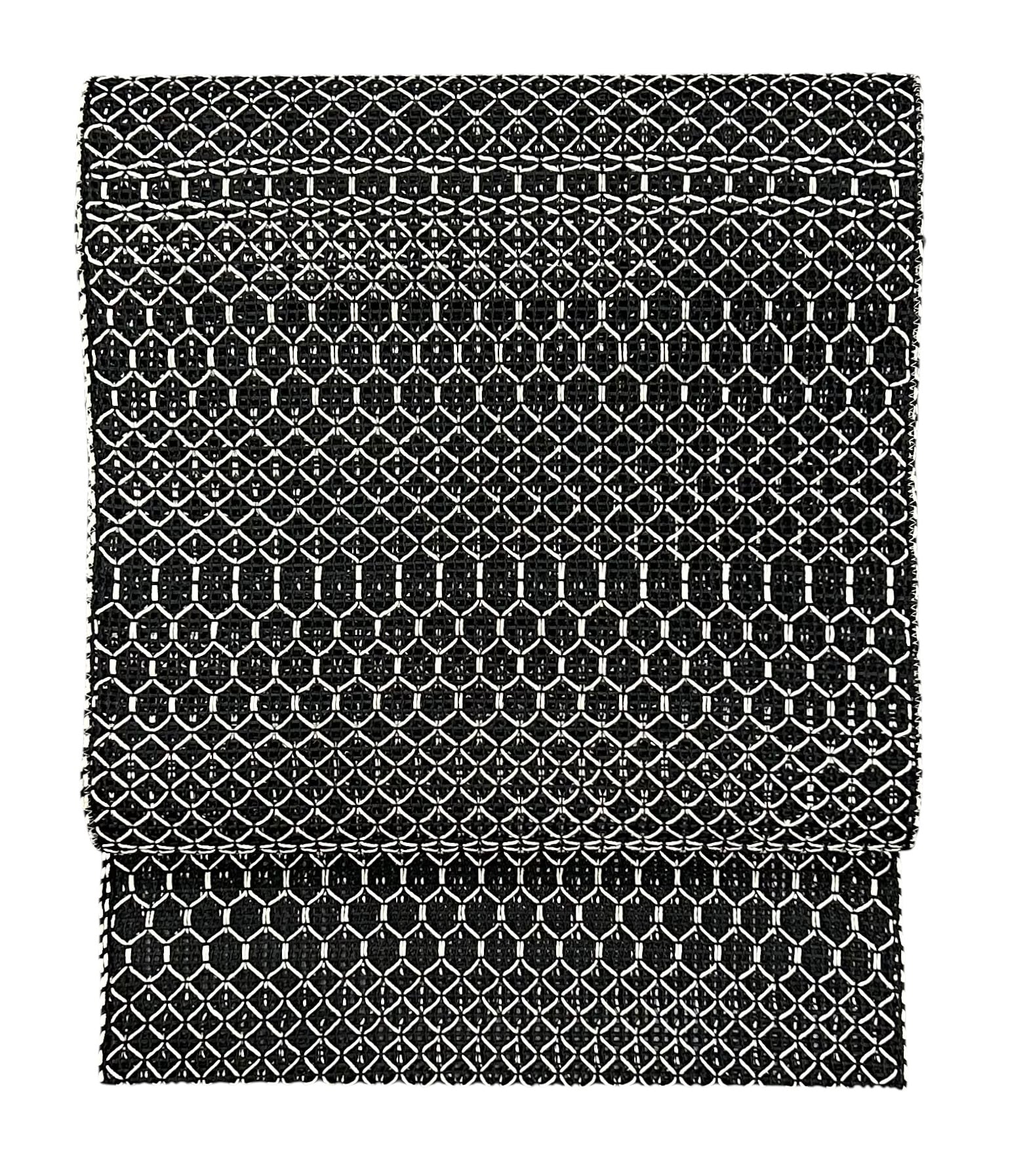 粋でクールな印象を与えるこの夏帯は、モノトーンのデザインが特徴です。色調は落ち着いた黒と白のコントラストが際立ち、シンプルながらも存在感のある一品となっています。八寸の幅は、スタイルを選ばず幅広いシーンでお使いいただけ、特にカジュアルな着物や夏物にぴったりのアクセントとなるでしょう。