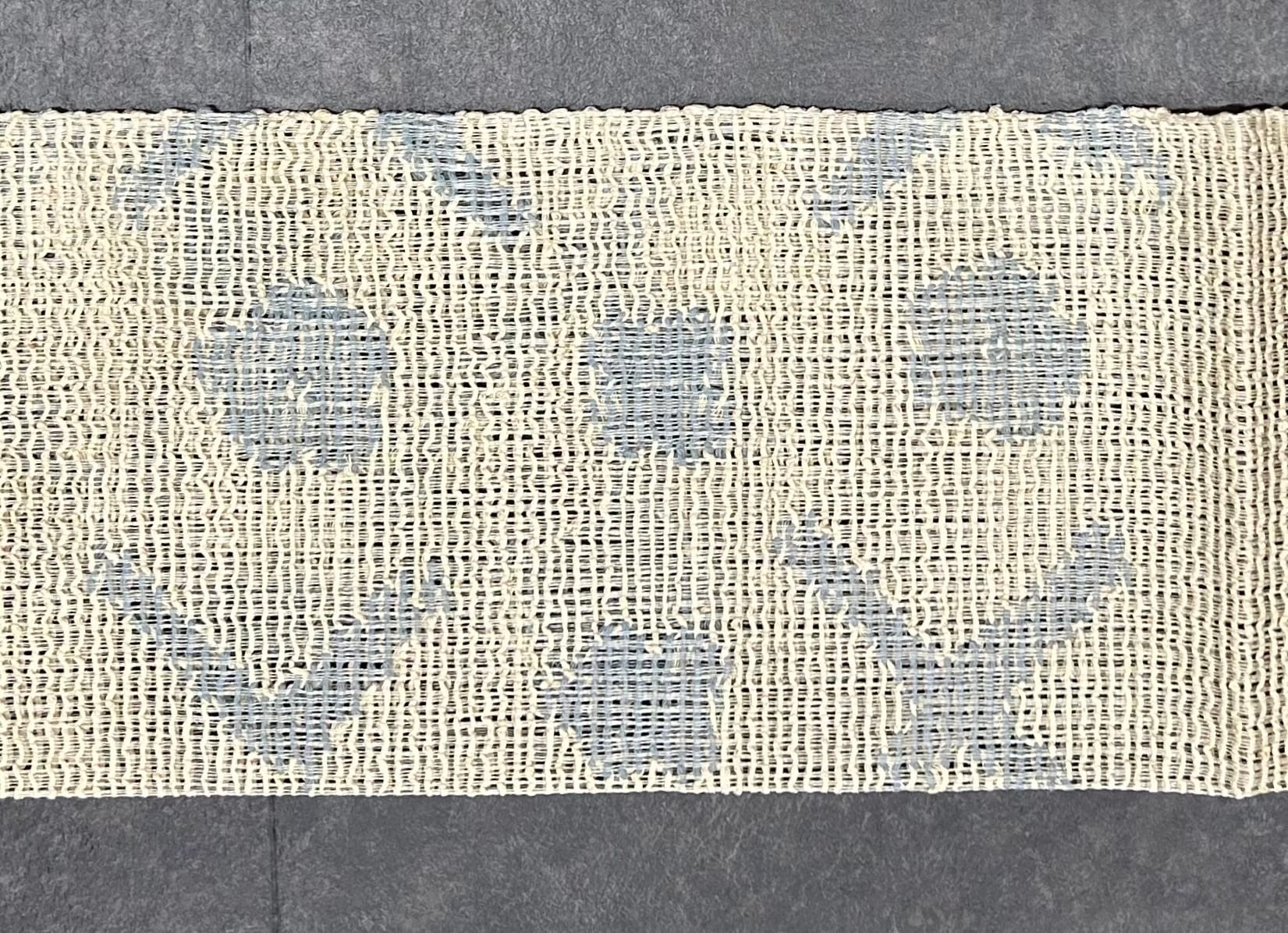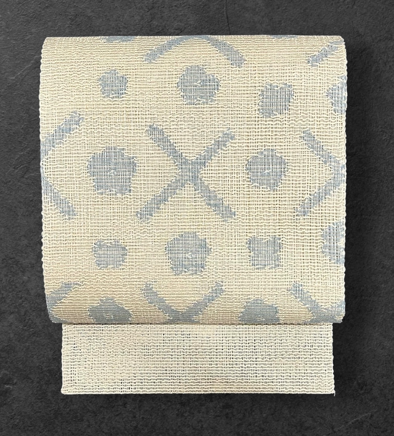 砥粉糸の地にグレーがかった秘色色の個性的なお太鼓柄で、程よいハリとざっくりとした肌触りの経糸に紗、緯糸に羅を使ったような名古屋帯です。