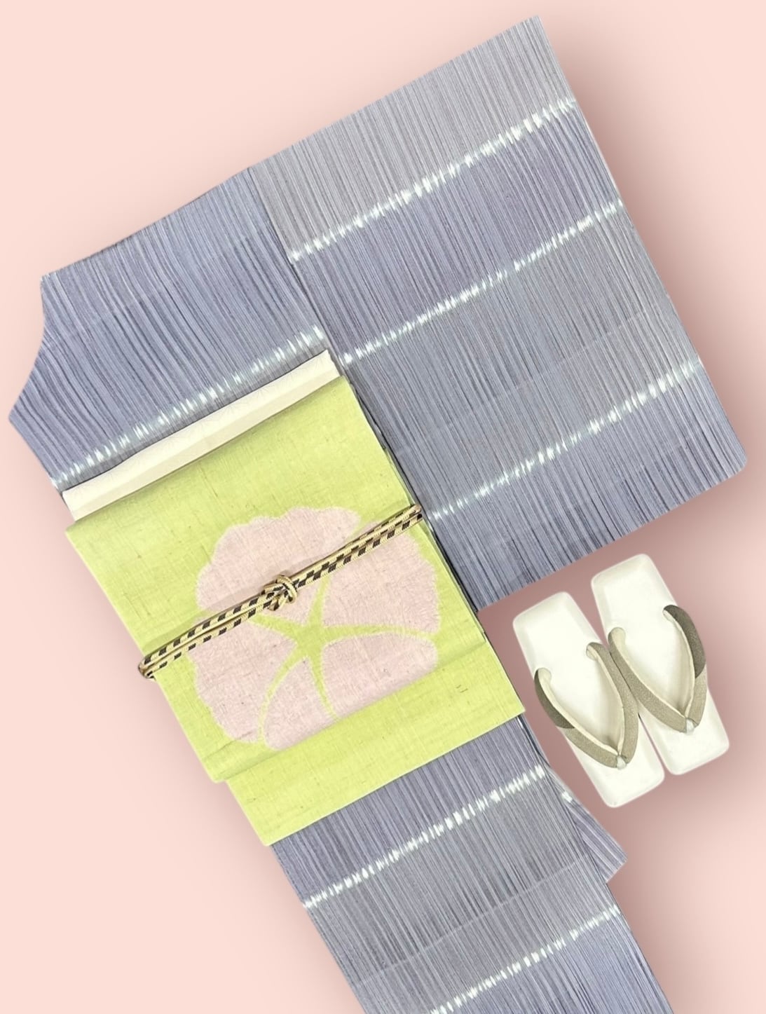 美しい紫とグレー系のグラデーションが特徴的な、すばらしい板締め絞りの紬 単衣のお着物です。爽やかなお色味が魅力的で, さらっとした肌触りが実現されており、肌に優しく着心地抜群です。季節を感じながらおしゃれを楽しむことができます。