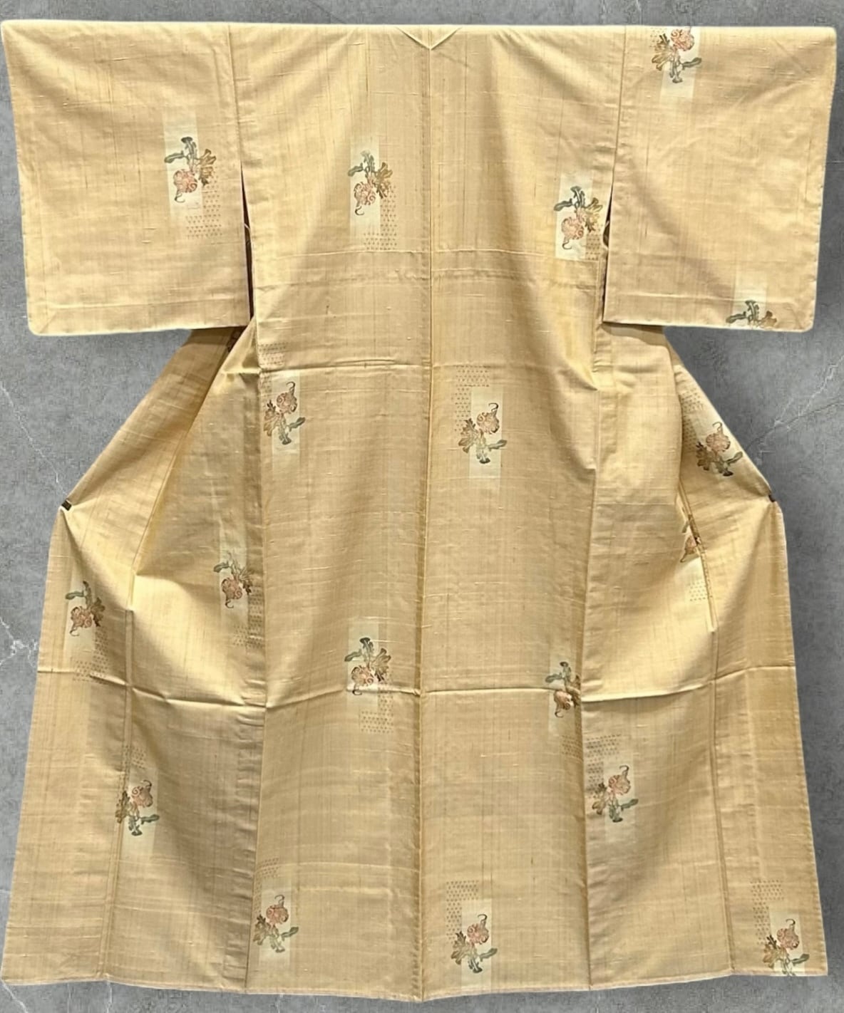 単衣 紬 白っぽい飴色の地 十字絣と凝った型染のカブの飛び柄 未使用 裄丈 65㎝ K5630