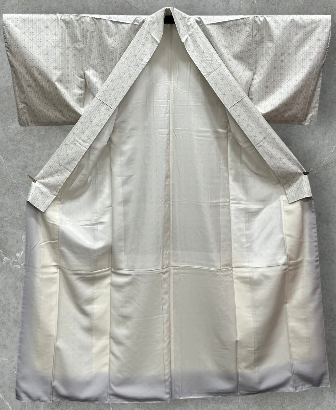 美しい白大島の着物をご覧ください!象牙色や白花色、白藍色、牡丹色、灰桜色など、様々な淡い色彩の細い縦縞の美しい地に、墨色や青緑色、菫色などで施された 星砂絣模様が素敵です。 スベスベとした感触と適度な張りがあり、優雅な装いを引き立てます。織元 むらなか
