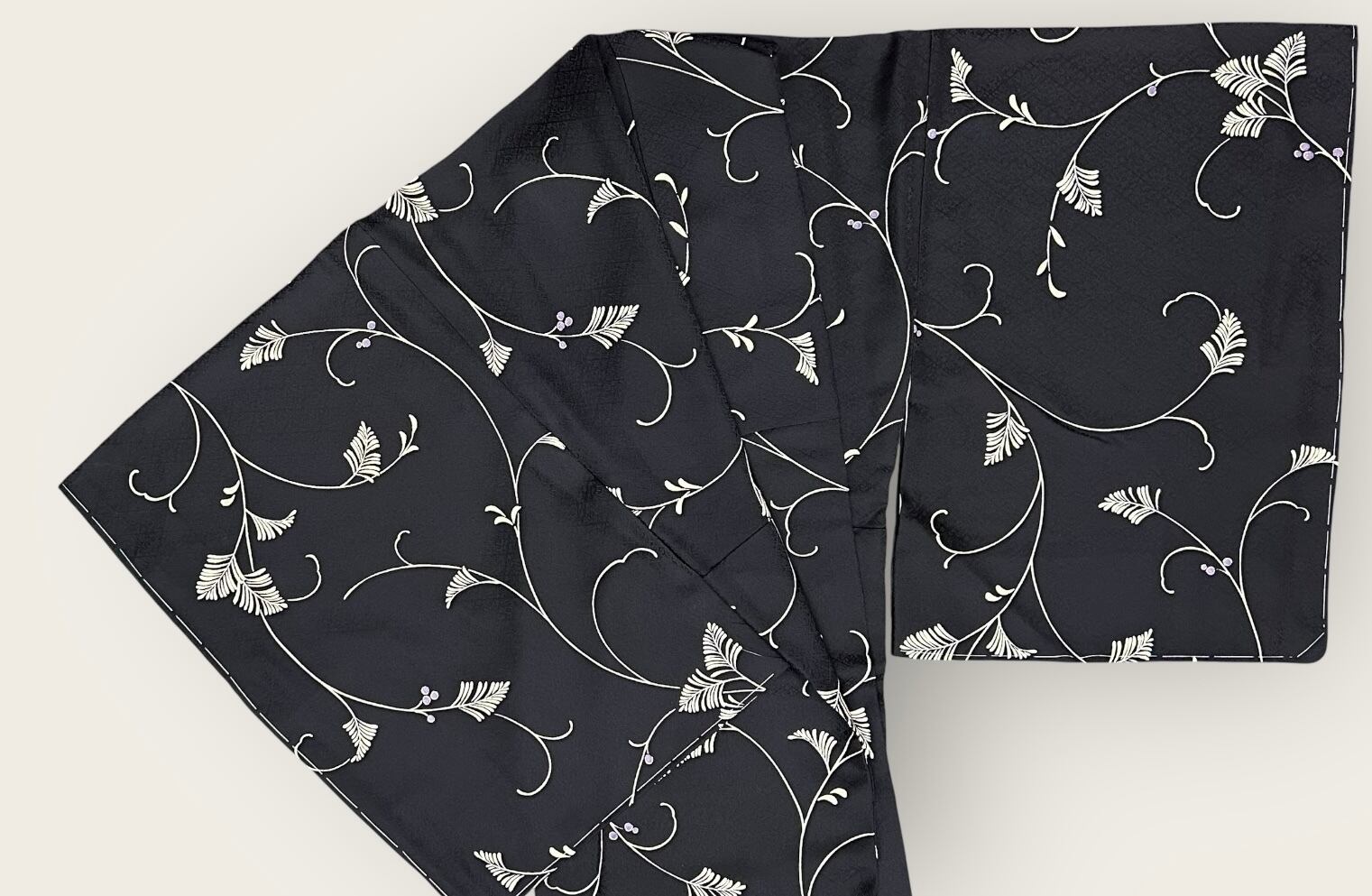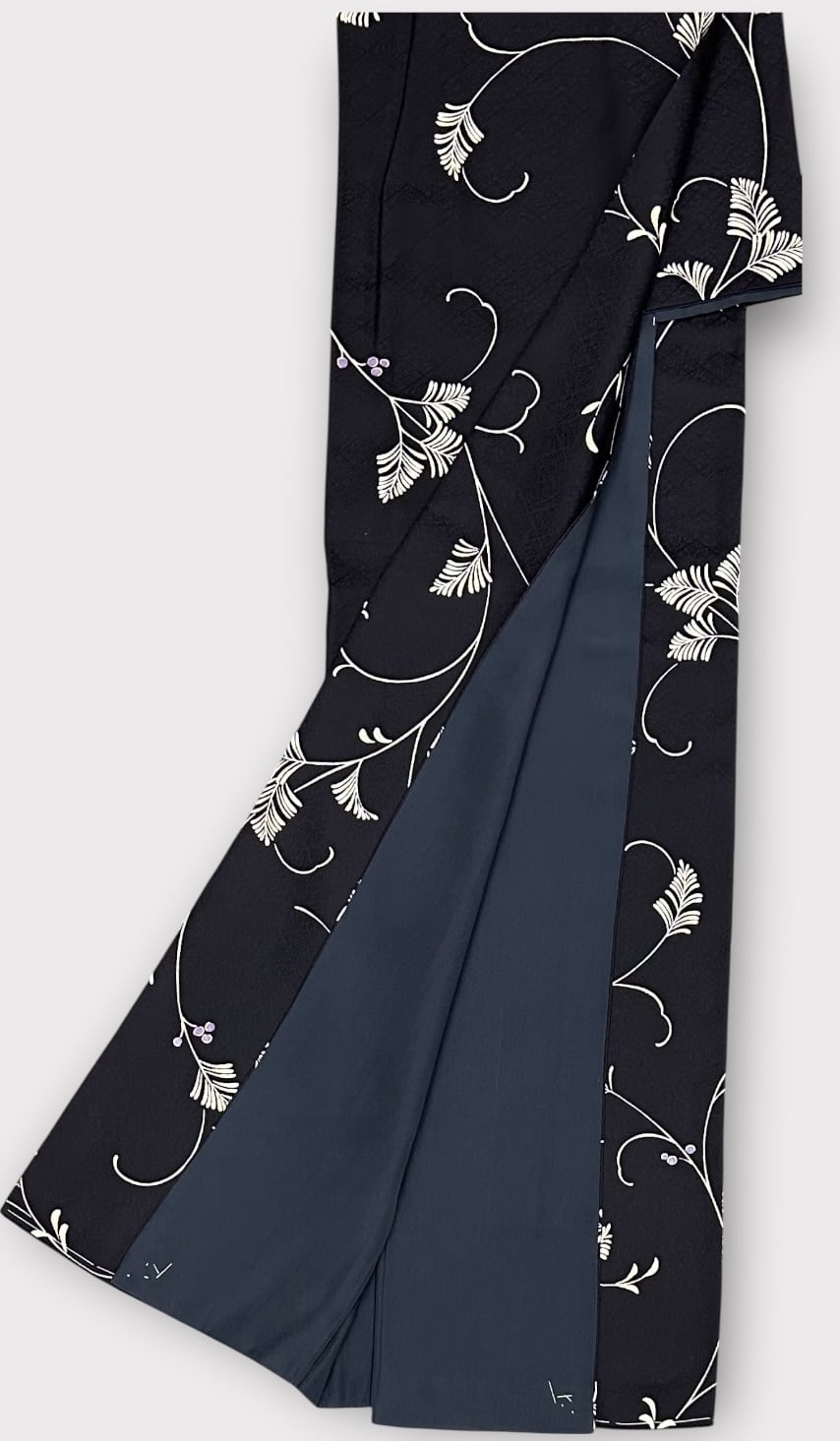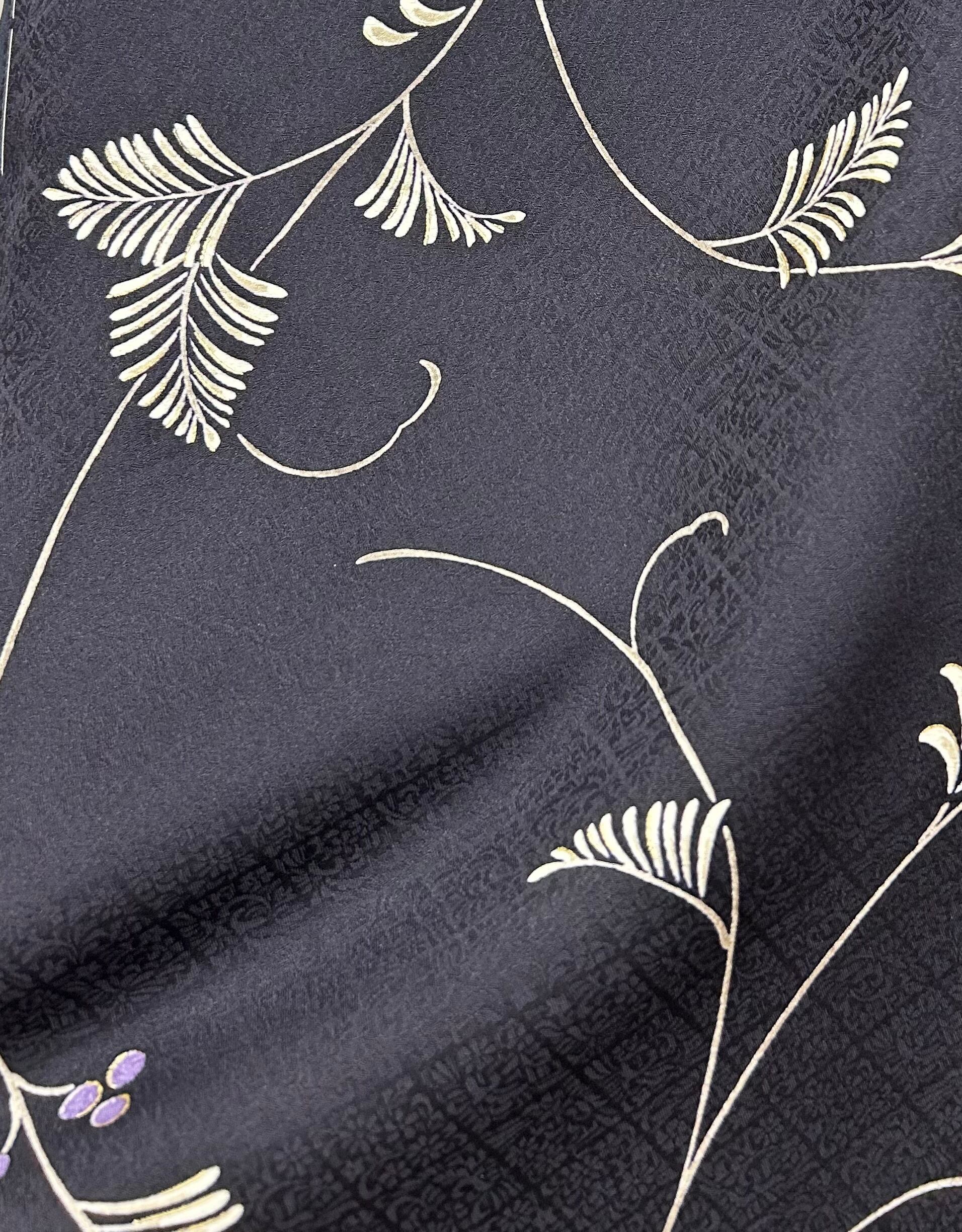 黒地に菱紋のような地紋が施された地に、生成り色と樺茶色などに所々ほんのりと金彩が施された上品な唐草紋様のお洒落なお着物です。程よいハリ感があり、軽やかな印象を引き立てます。パールトーン加工済、しつけ糸つき。