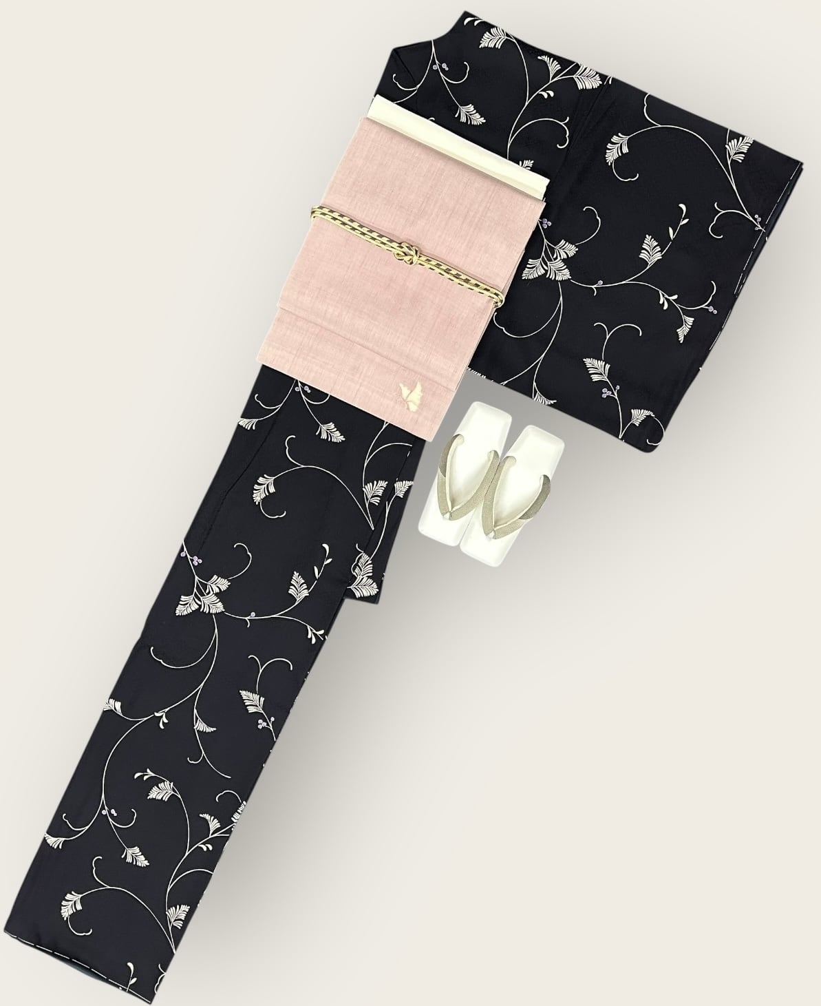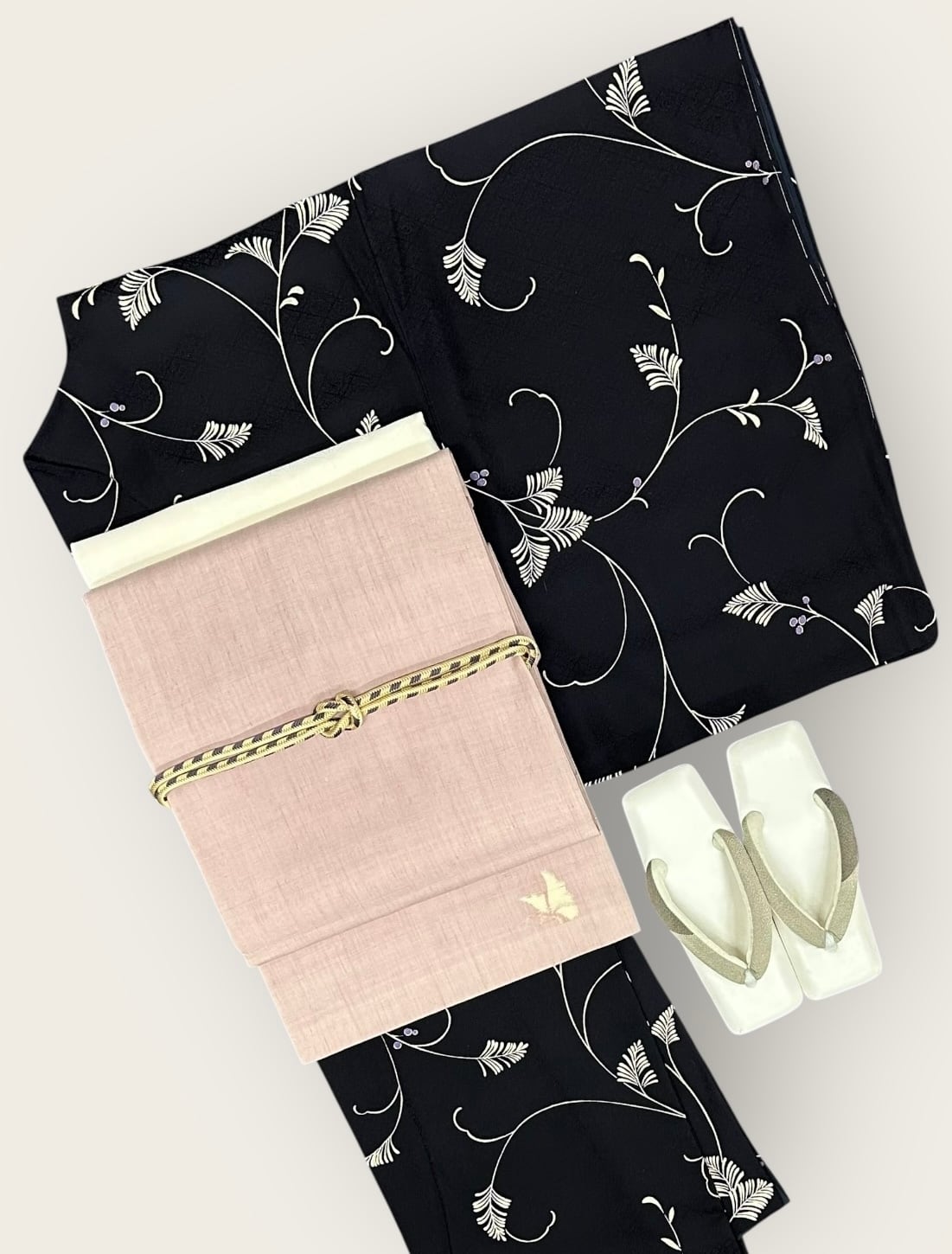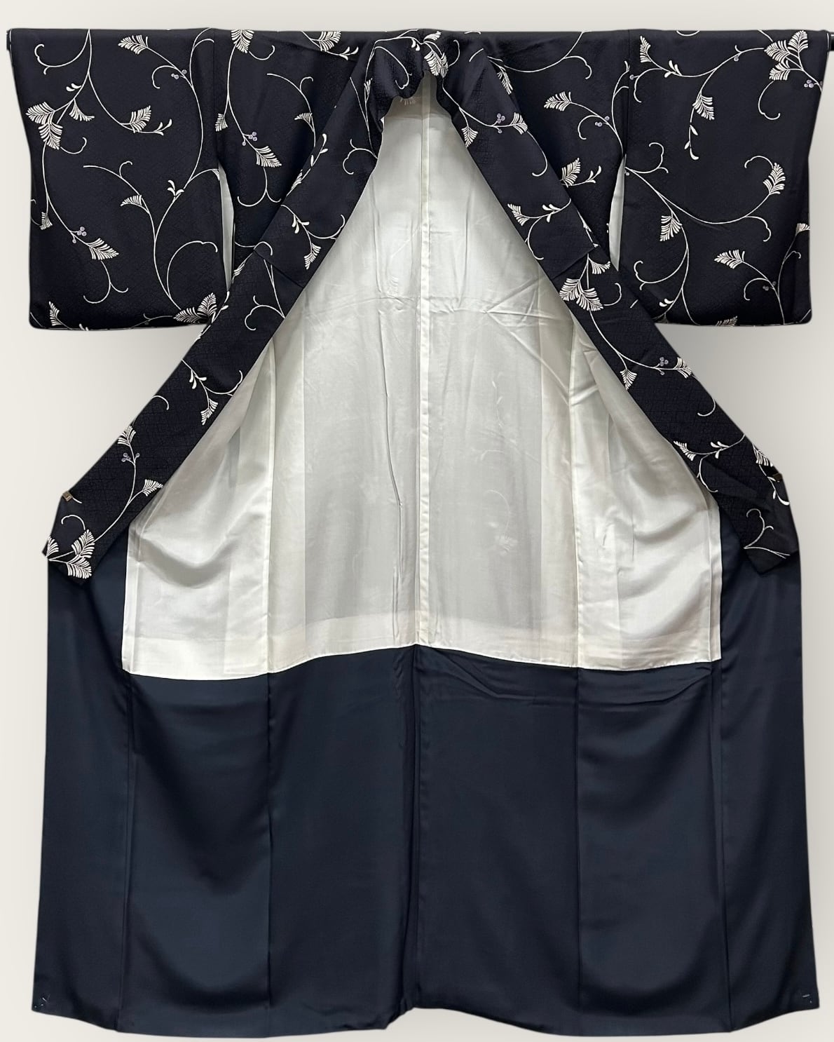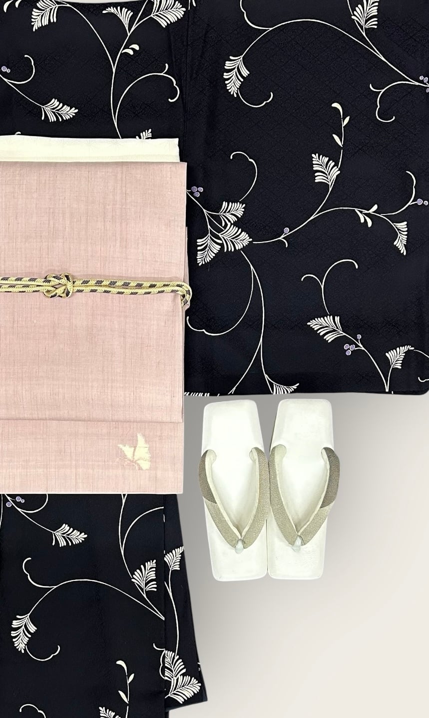 黒地に菱紋のような地紋が施された地に、生成り色と樺茶色などに所々ほんのりと金彩が施された上品な唐草紋様のお洒落なお着物です。程よいハリ感があり、軽やかな印象を引き立てます。パールトーン加工済、しつけ糸つき。