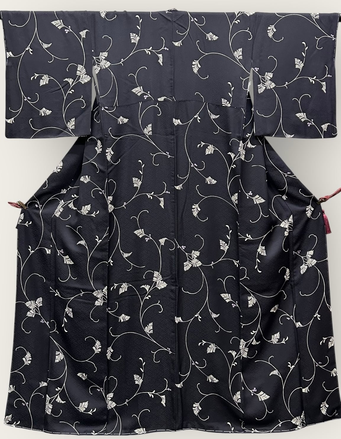 小紋 黒地 菱紋のような地紋 上品 唐草紋様 未使用 裄丈65.5 ㎝ K5040