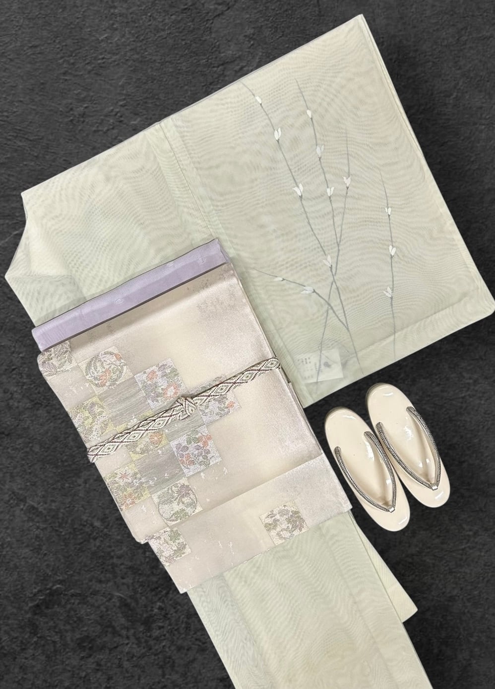 黄色がっかた若芽色の地に、ほんのりとパステルがかった植物柄が施された紗袷のお着物のご紹介です。薄い生地から下の生地の柄が透けて見える 大変上品で優雅なお着物です。柔らかめでありながら、ほんのりとしたハリ感があります。
