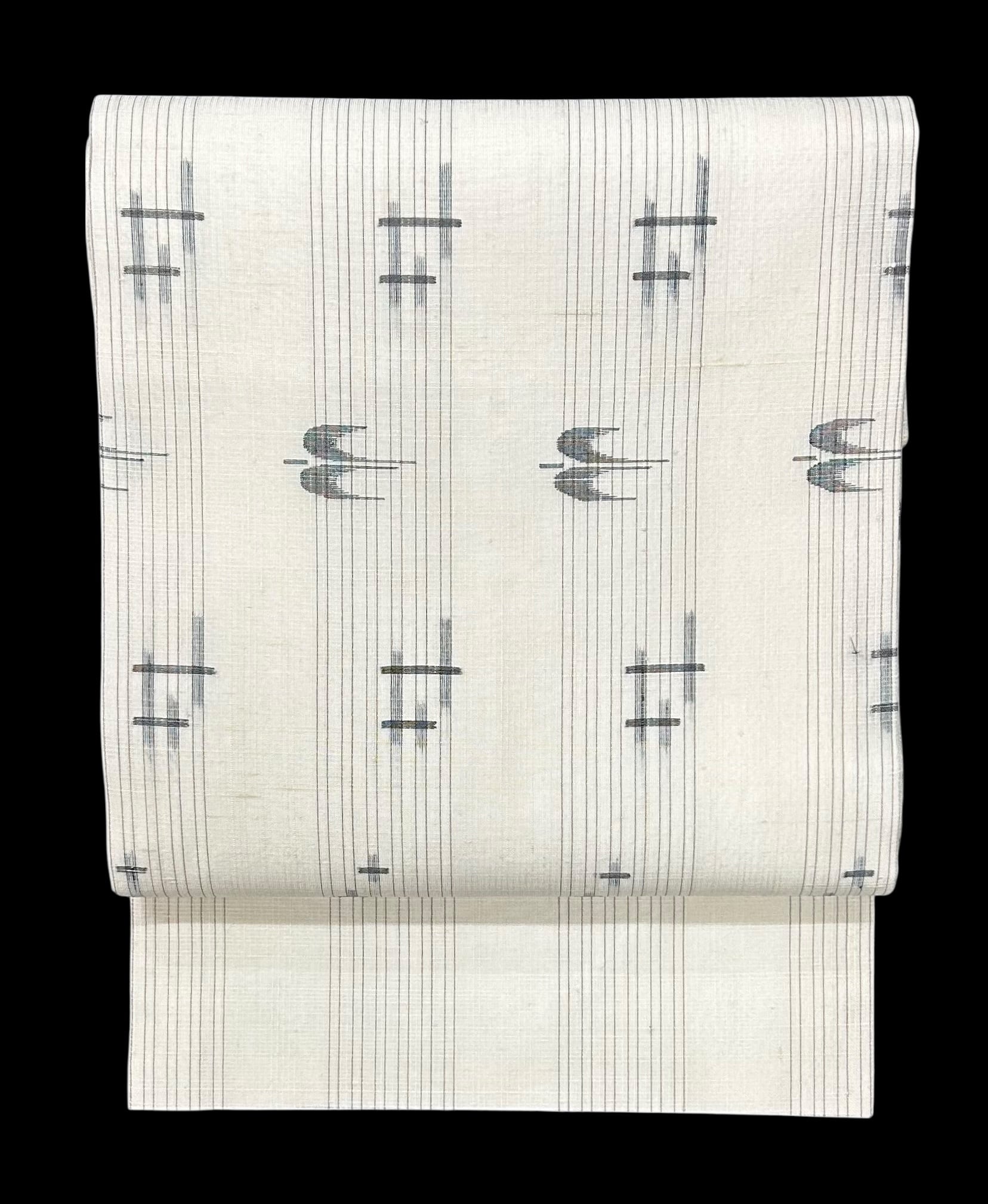 生成り色の地に墨色の絣模様が施されたこちらの帯は、燕と縞のデザインが特徴的で、落ち着いた印象を与えます。パリッとしたハリ感があります。