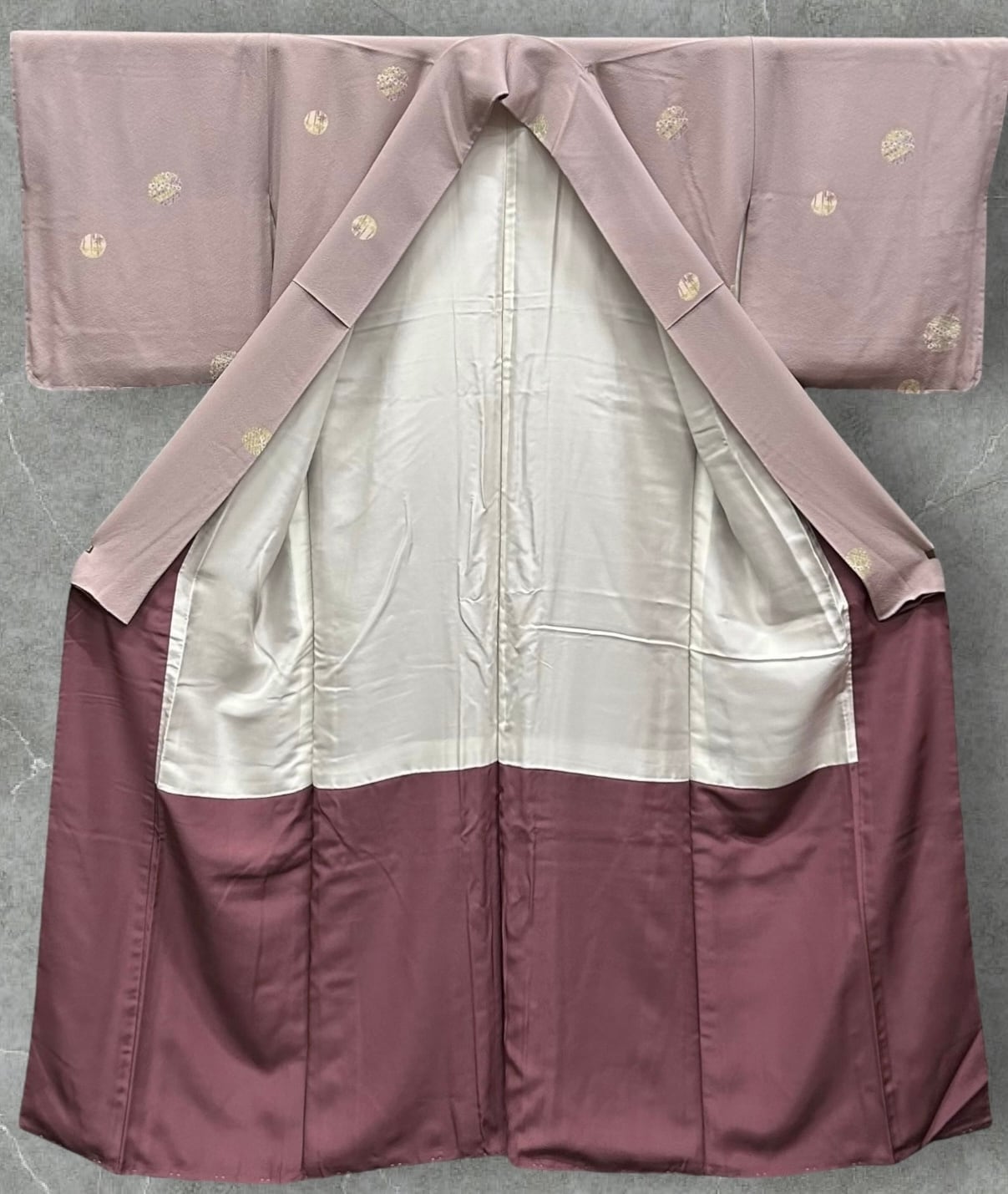 小紋 渋めの薄柿色の地 かわいい模様の丸い飛び柄 しつけ糸つき 裄丈 66.5㎝ K4889