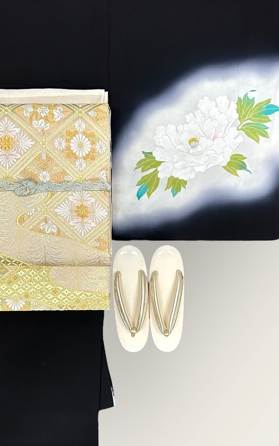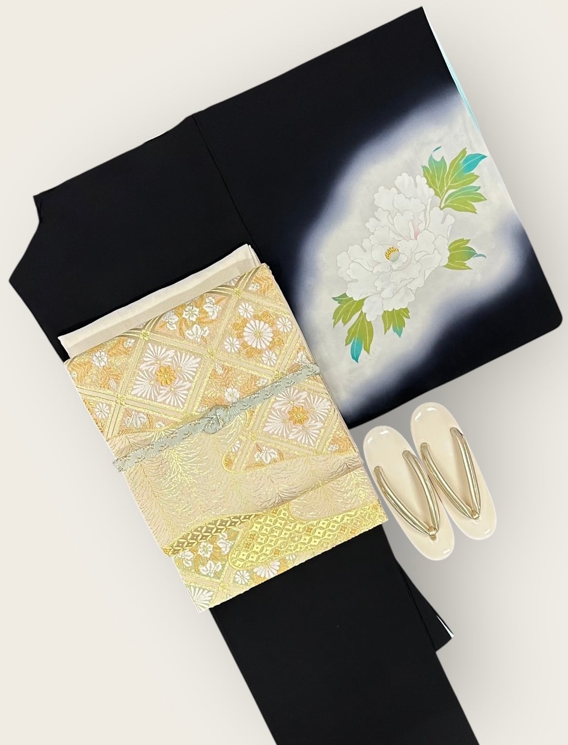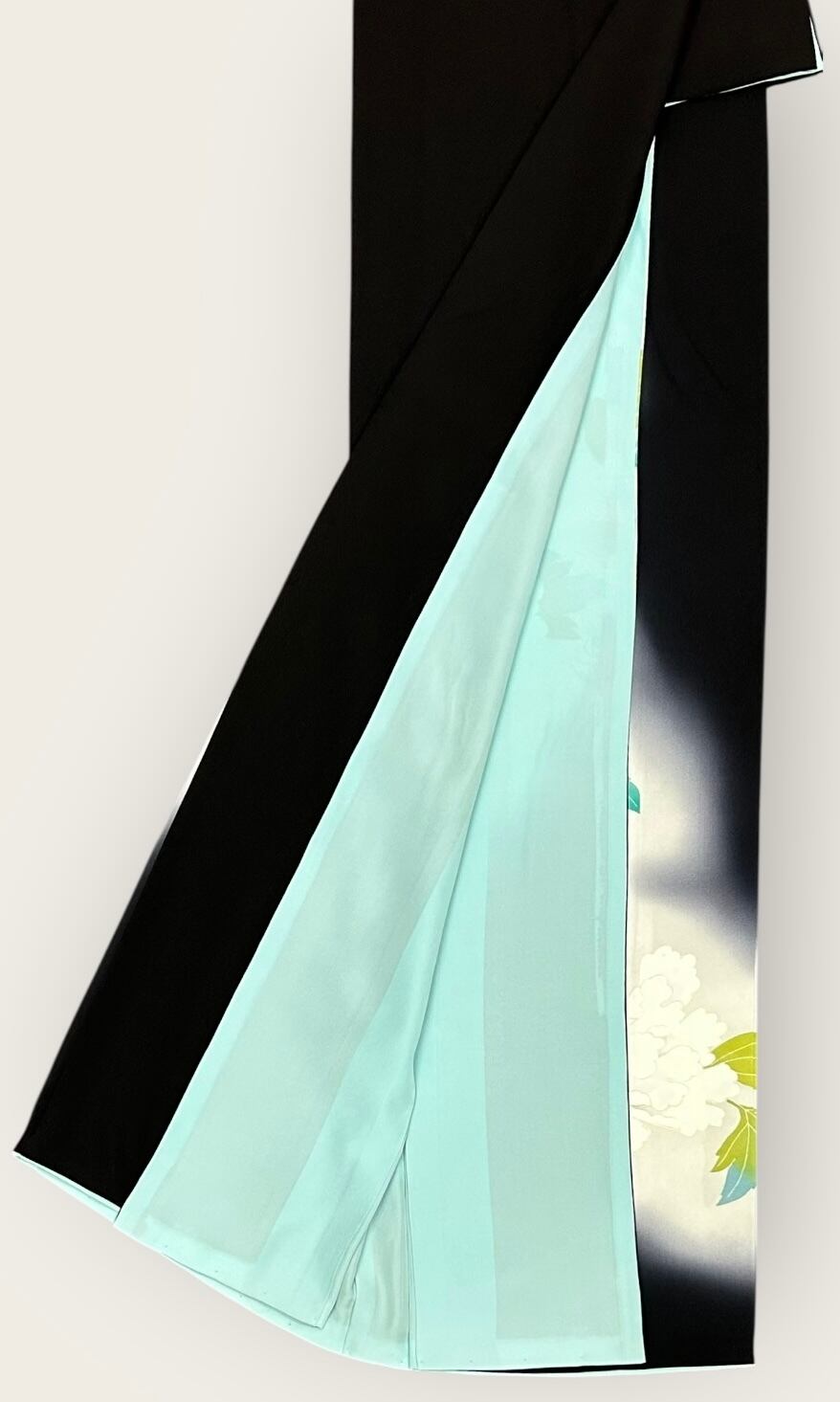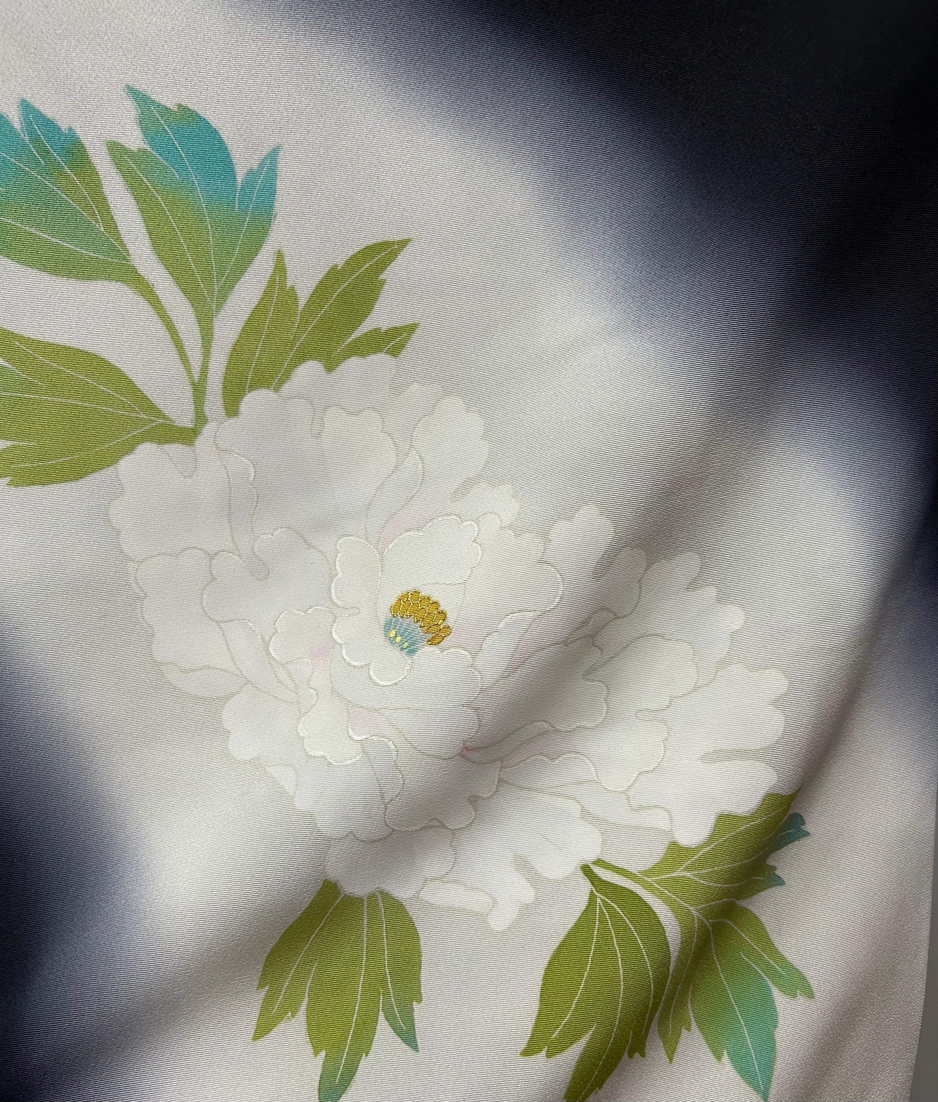 黒地に鮮やかな白い牡丹が描かれた訪問着です。豪華で艶やかなデザインが見る人を引きつける一品です。なめらかな肌触りは、着用時の心地よさを約束し、上品なシルエットを演出します。