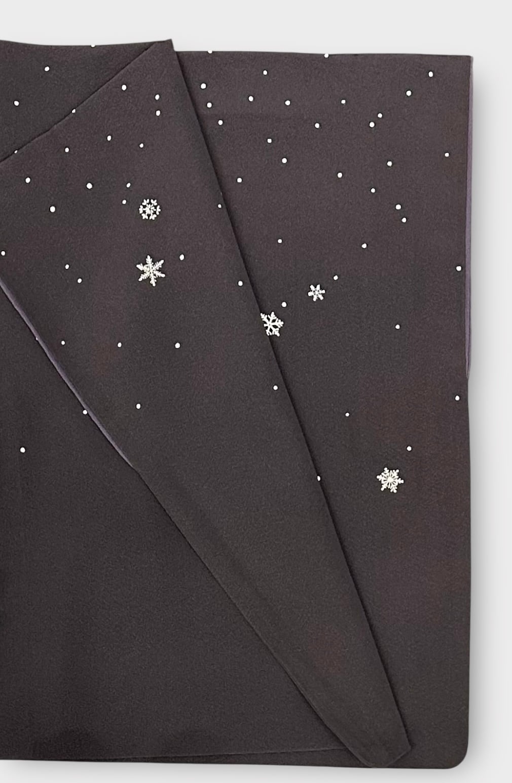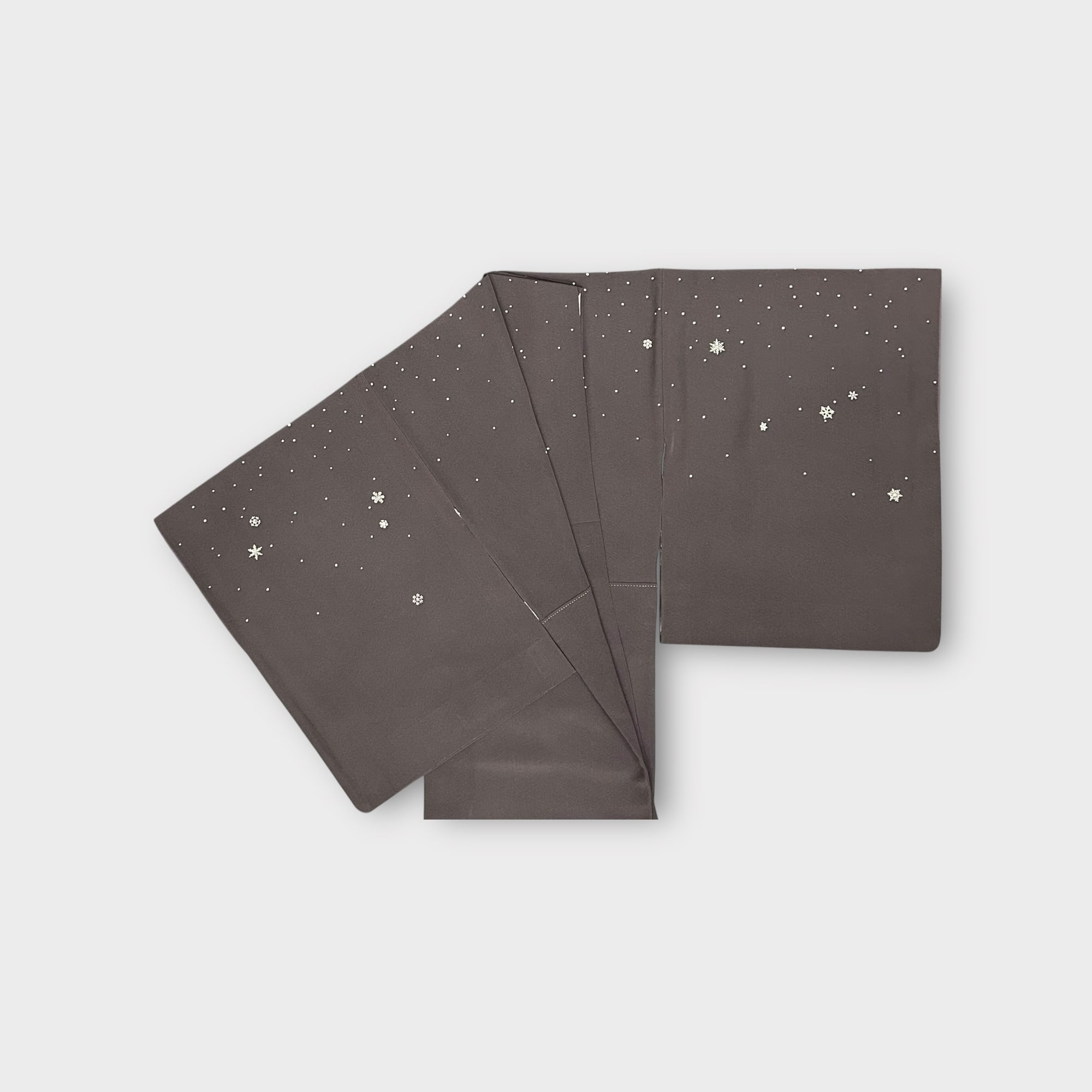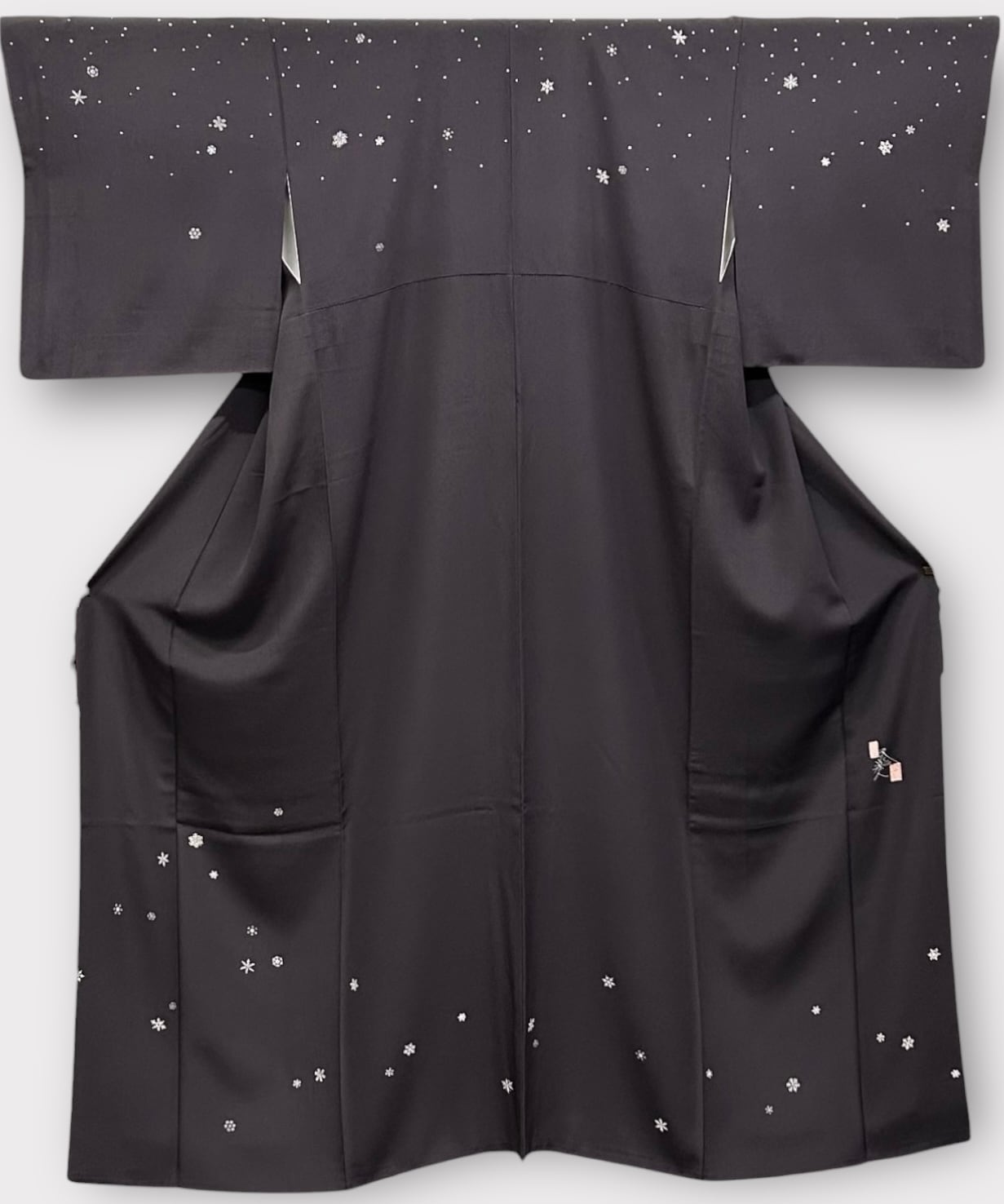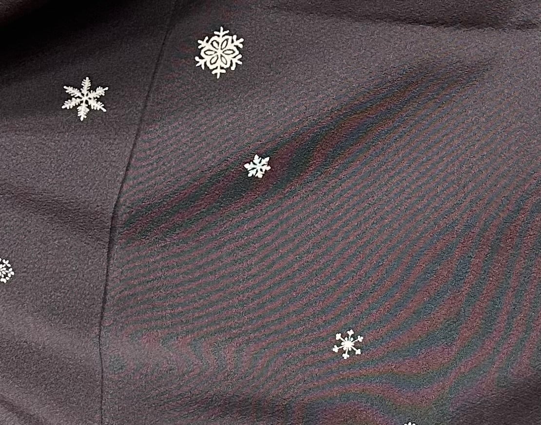落款のついた洛楽人工房さんの作家物のこちらの付け下げは、紅消鼠色の地に小雪や雪の結晶が舞い散る美しいデザインが魅力です。しなやかな肌触りが心地よく、着る人を優雅に演出します。さが美のタグつき。