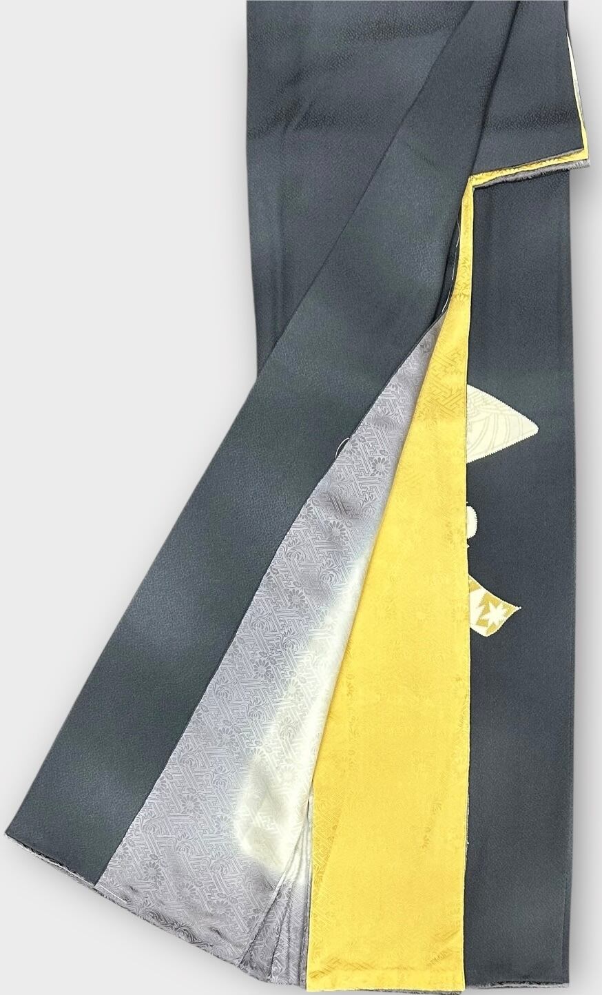 こちらの付け下げ訪問着は、藍墨茶色の暈しの地に繊細な凹凸のある地紋が施され、生成り色や芥子色で描かれた宝尽くしや短冊の柄が相良刺繍で縁取られています。卵色の比翼がついており、上品かつ華やかな印象を与える一品です。ぽってりとした地、しつけ糸つき。