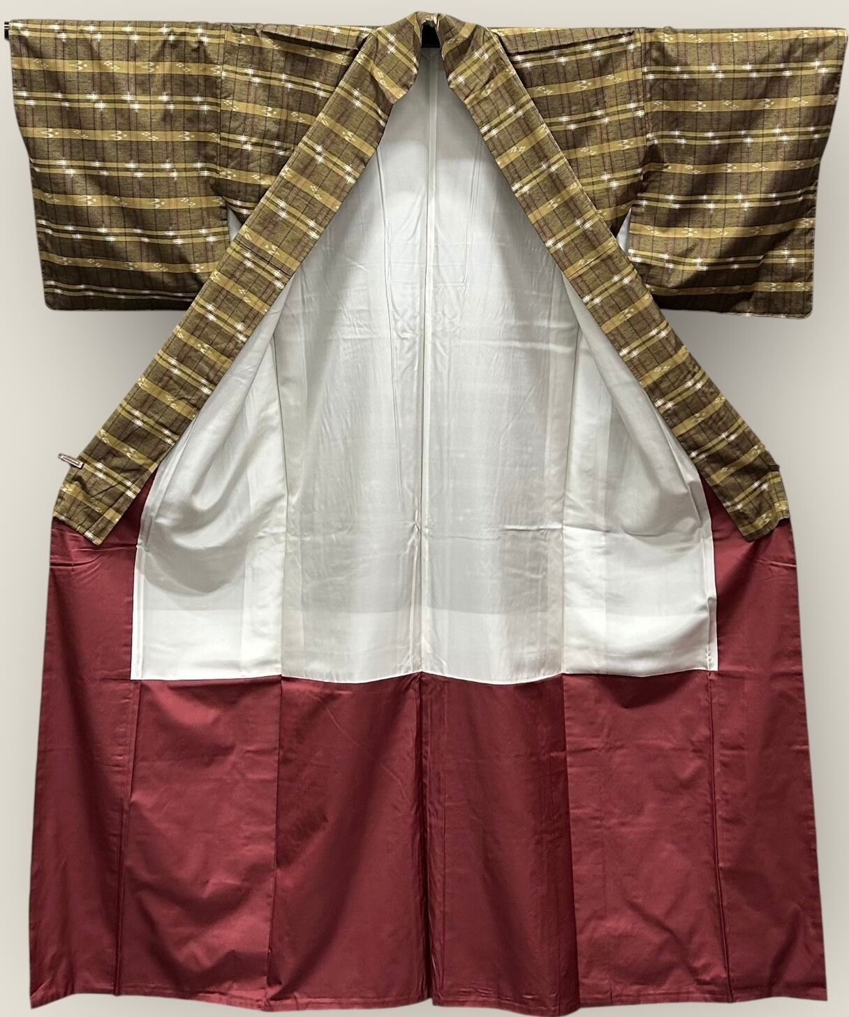 紬 茶系の琉球柄 しつけ糸あり 裄丈 67㎝ K5619