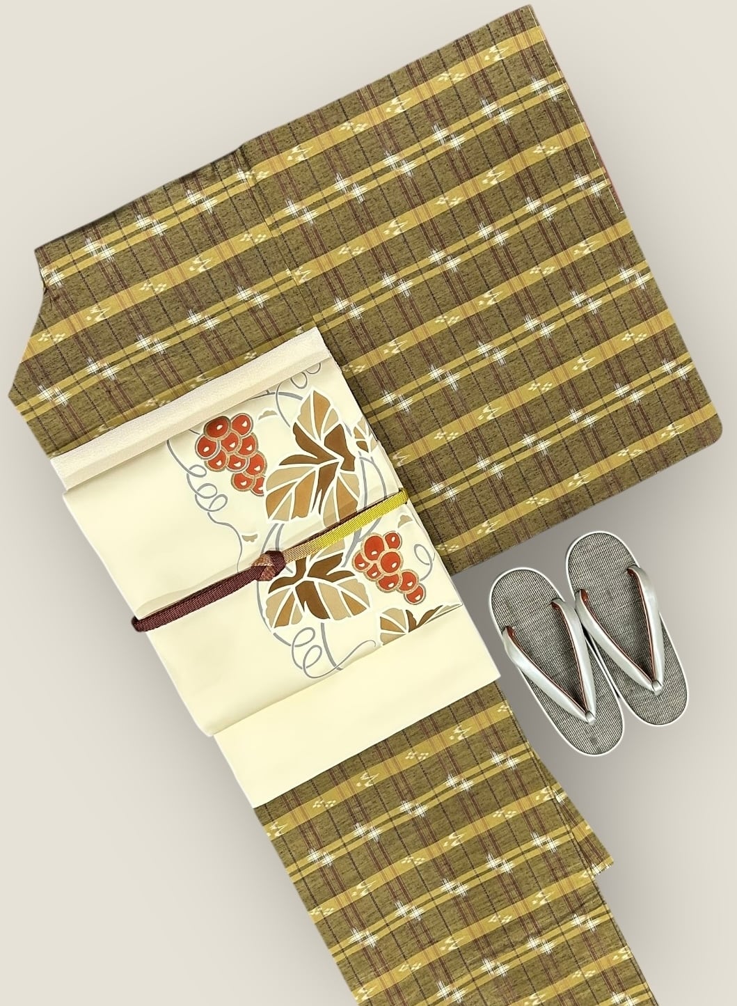 ハリのある地に、白い琉球柄が入った黄橡色と黄橡色にフシの多い濃藍の糸を混ぜ合わせたような独特の色合いで横段が表現されています。縦線には濃藍、白、浅葱蘇芳色が施され、遠目には格子柄として優雅に映えるデザインとなっております。特別なシーンや日常の装いにもおすすめで、装いに品格を与えることができます!