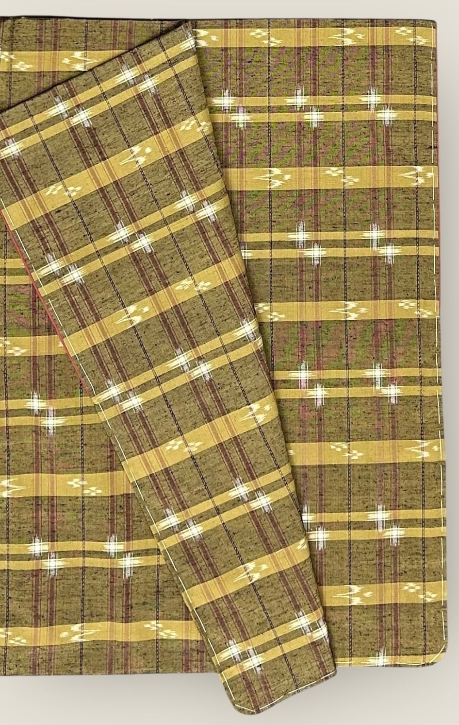ハリのある地に、白い琉球柄が施された黄橡色の生地が魅力の一品です。フシの多い糸を混ぜ合わせた色合いが特徴的で、縦線に強い濃藍色と白、そして浅葱蘇芳色を使って、巧みに横段で織り上げられています。遠目には格子柄のように見えるこのデザインは、シンプルながらも上品さを感じさせ、特別なシーンや日常の装いにぴったりです。