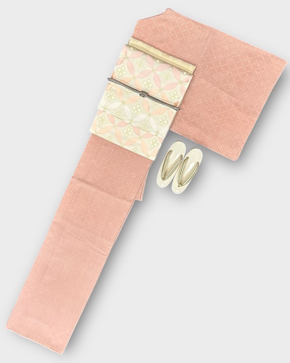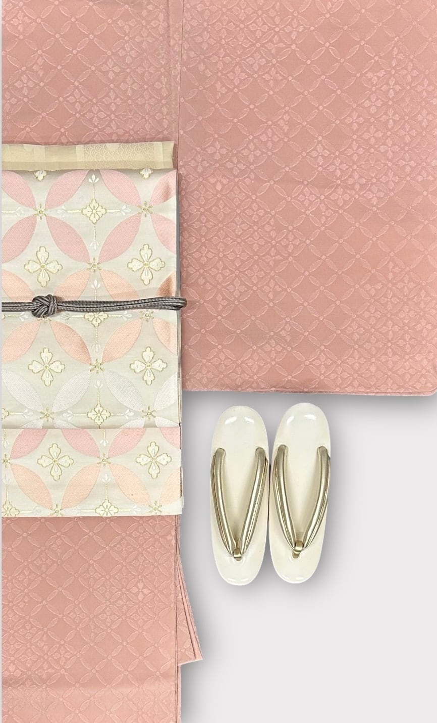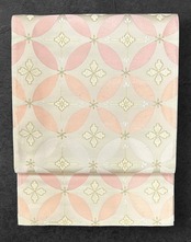 こちらの袋帯は、生成り色の地に華やかな七宝つなぎの柄が施された、優雅で美しい一品です。金糸と虹色から桜色、さらに珊瑚色のお柄が装いに華やかさを添え、特別な瞬間を演出します。柔らかめのお品です。