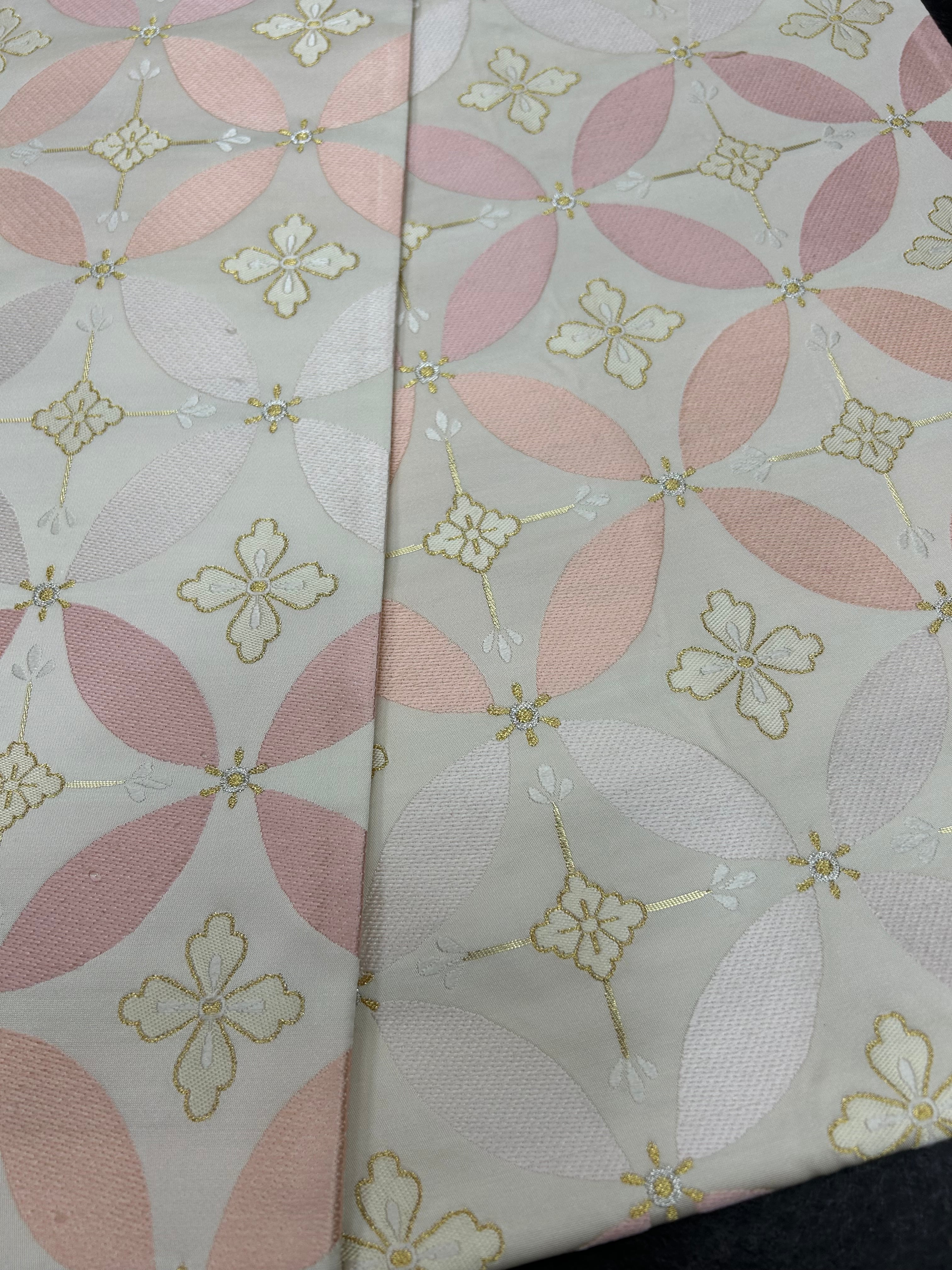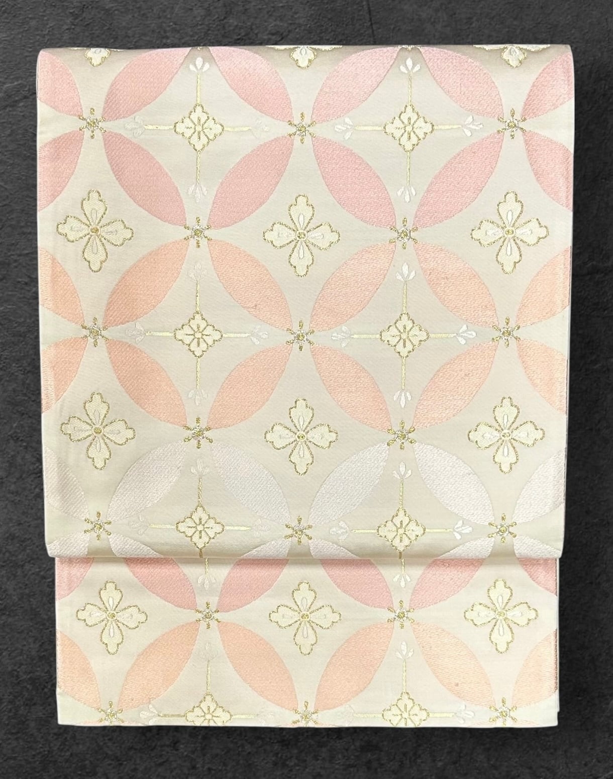 袋帯 生成り色の地 虹色 桜色 珊瑚色 金糸などの華やかな七宝つなぎ 長さ 443㎝ Q5825