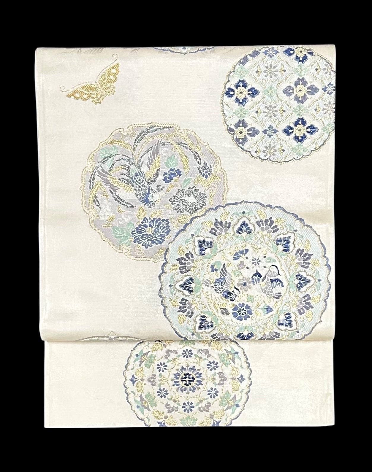 こちらの袋帯は、胡粉色の美しい地に創冠輝宝葉紋が施された、華やかでありながら上品な一品です。草花の地紋が繊細な印象を与え、青藍色の濃淡や瓶覗色、金糸が装いに輝きを加えています。宝相華や鳳凰、鴛鴦、蝶などのモチーフが見事にデザインされ、特別なシーンを一層引き立てることでしょう。薄めでハリのある質感が、装着時に心地よさをもたらします。