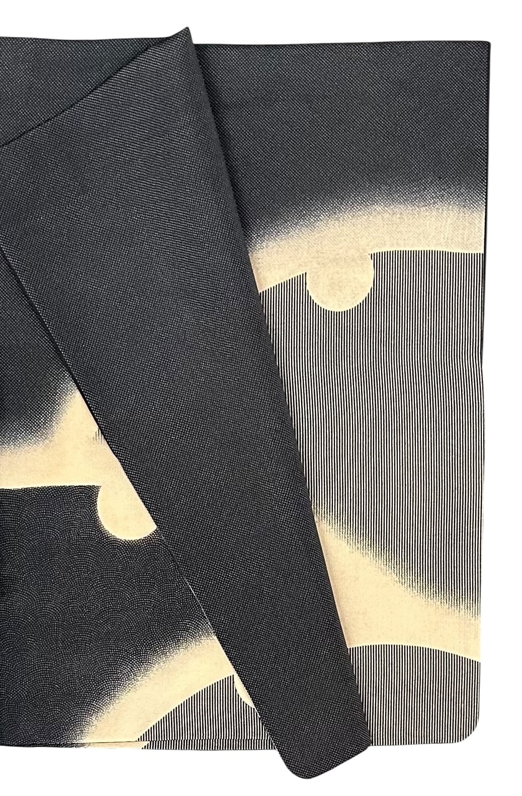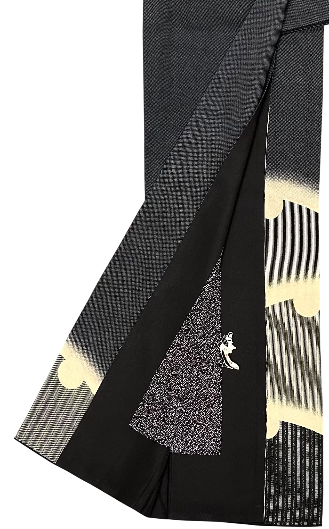 こちらの付下げは、黒地に江戸小紋柄を施した粋な一品です。白茶色の柄で区切られたところに色々な柄の江戸小紋が大胆に表現され、華やかさを添えています。八掛があられで女人が描かれるなど細部まで粋に仕立てられている、大島のようにツルツル、スベスベの地の個性的なお着物です。八掛もとても素敵です。