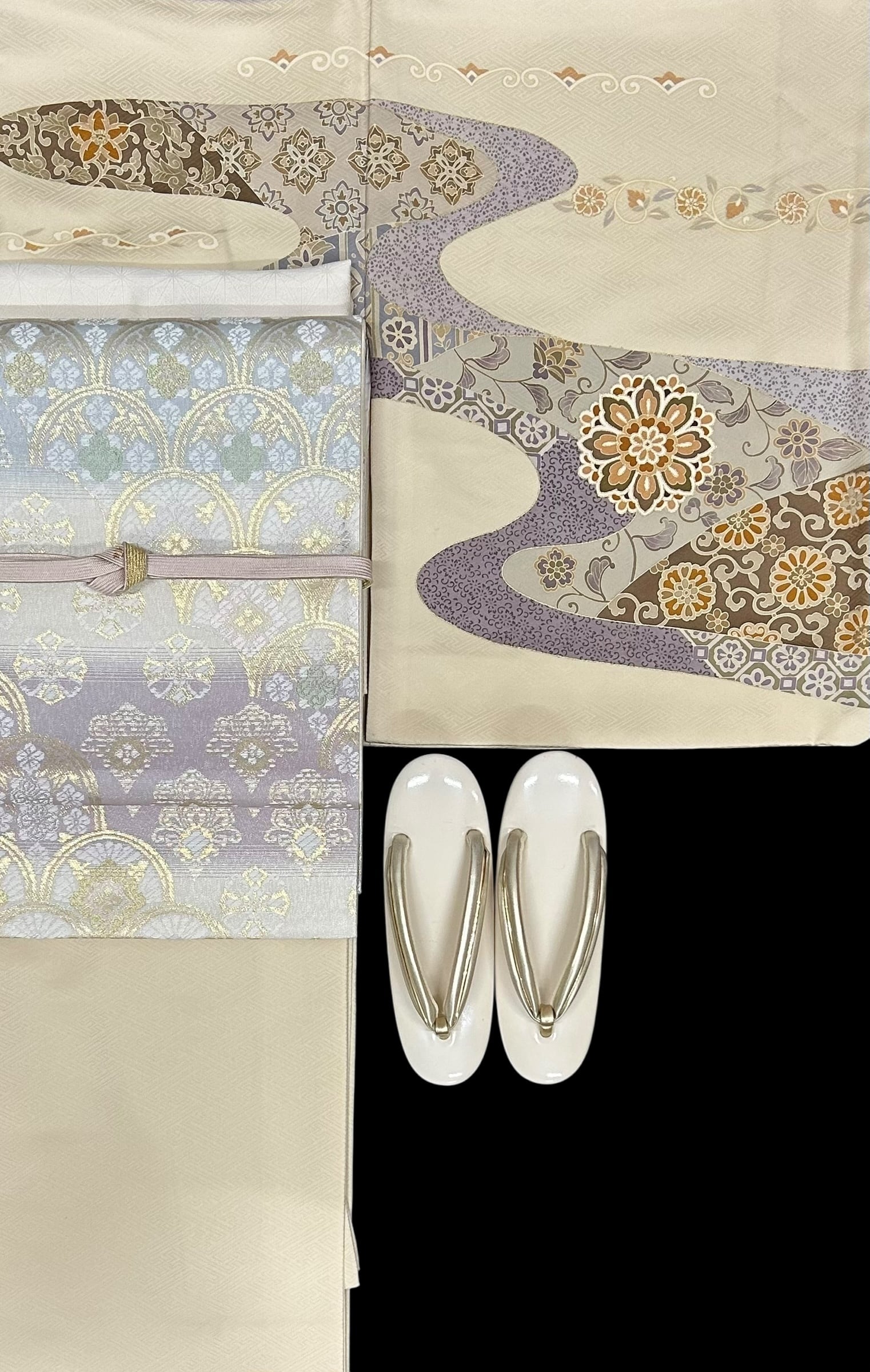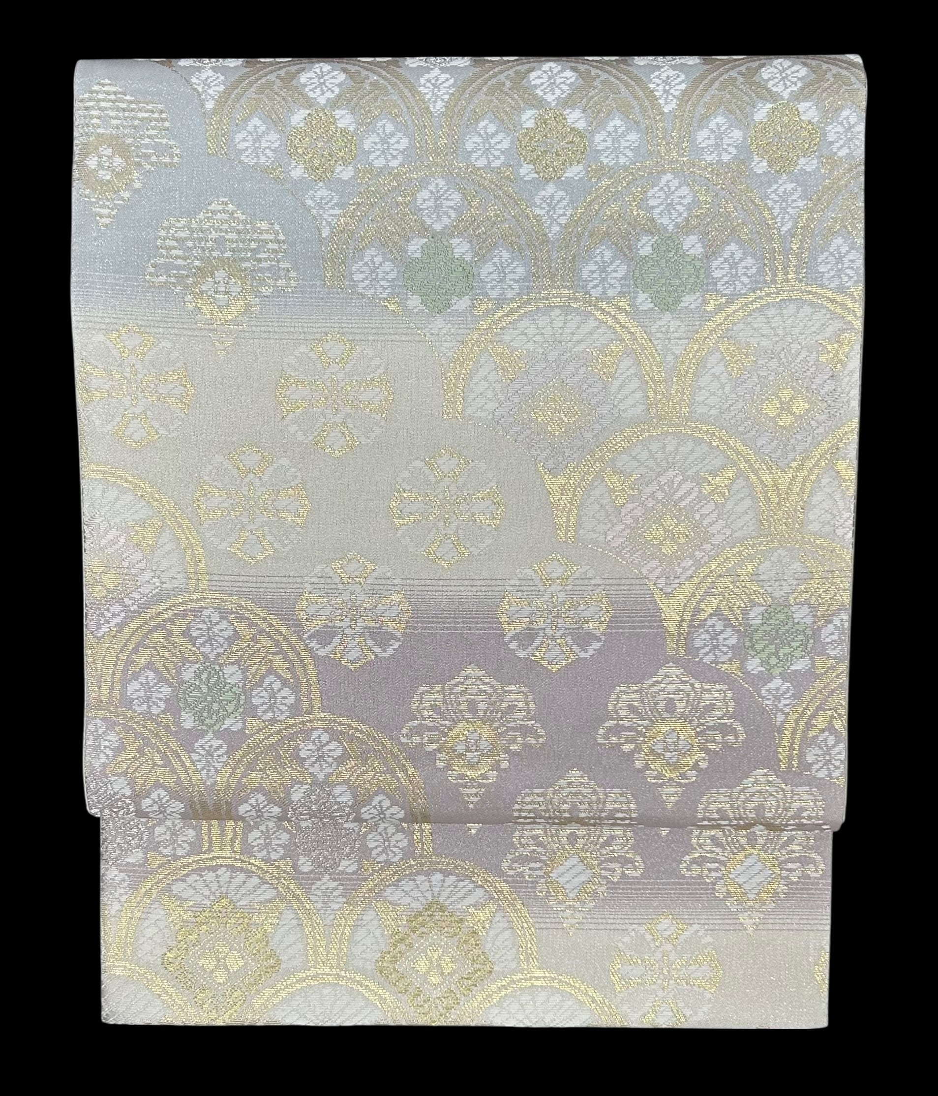 こちらは、象牙色、藍白、薄梅鼠の横段模様に金糸で美しく織り込まれた、上品な西陣、佐々木染職(株)さんの袋帯です。柔らかな風合いを持ちながらも、しっかりとした仕立てが特徴です。青海波の模様の中には、竹や花菱文などが幾何学的にデザインされており、白色や若葉色など淡い色合いが清楚さを引き立てています。特別な場面にもふさわしい アイテムで、どんな着物にも美しく調和します。