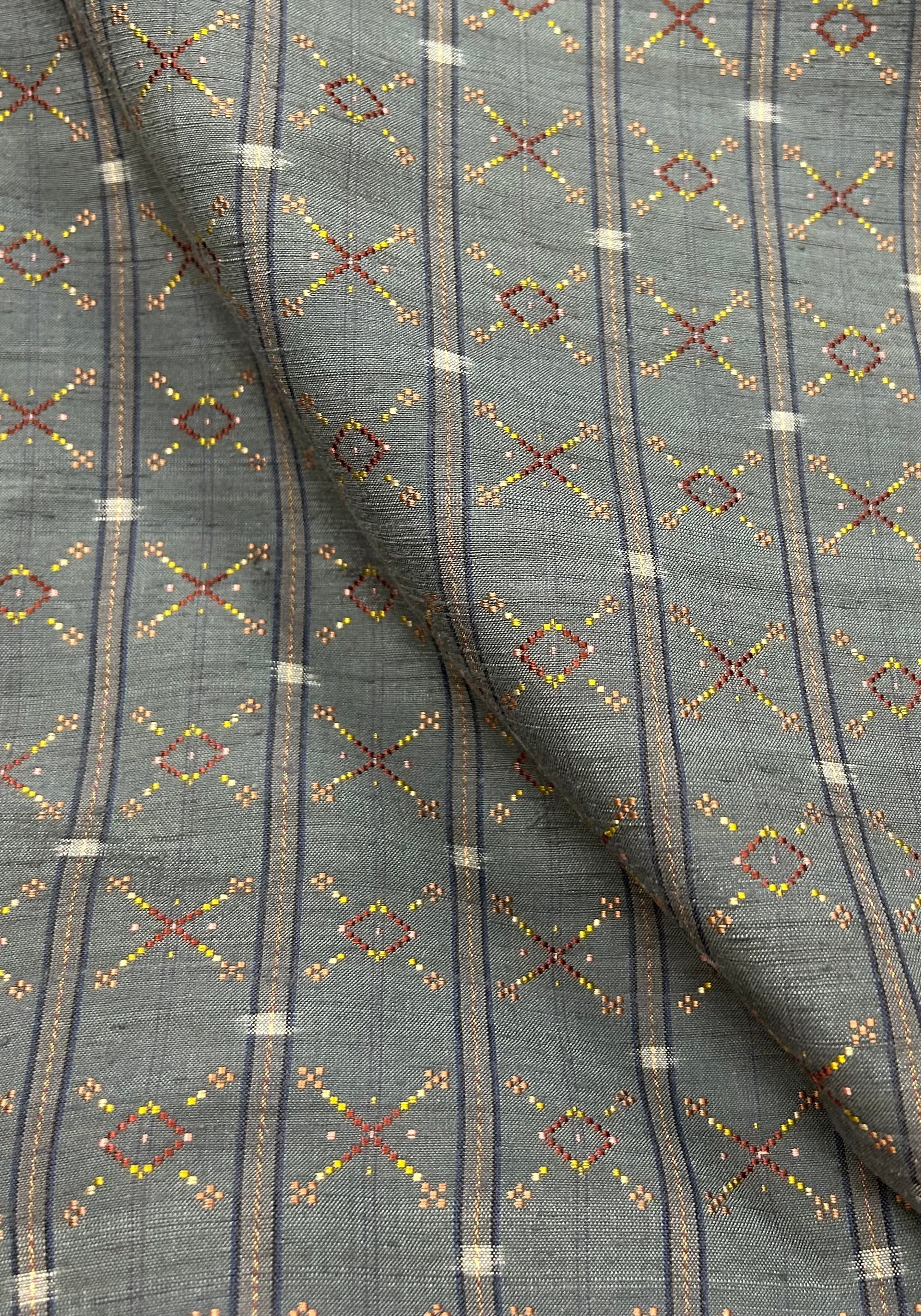 こちらは、くすんだ柳煤竹色を基調に、百入茶いろの縦線と焦茶、江戸茶、菜種油色、榛色の多彩な色糸で花のような幾何学模様が織り込まれた、沖縄伝統の美しい花織の一品です。柔らかな質感ながらも、しっかりとした仕立てが魅力です。その独特の模様は、特別な場面にはもちろん、日常使いにもぴったりなアイテムです。