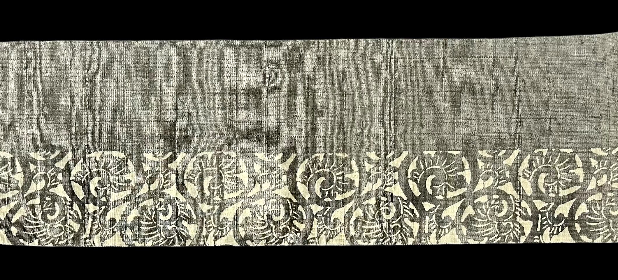 名古屋帯 紬 生成り色×鼠色 唐花模様 伊勢型染 作家物 落款あり 未使用品 長さ 379㎝ Q4980
