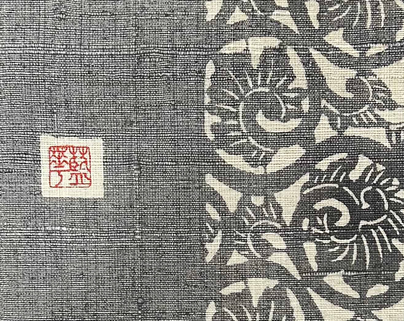 こちらは、生成り色と鼠色の地に、濃淡のある唐花模様が施された伊勢型染め名古屋帯です。パリッとしたハリのある質感が特徴で、どんな装いにも映える上品なお品です。唐花模様がさりげなく華やかさを添え、幅広くご利用いただけるアイテムです。作家物、落款つき。