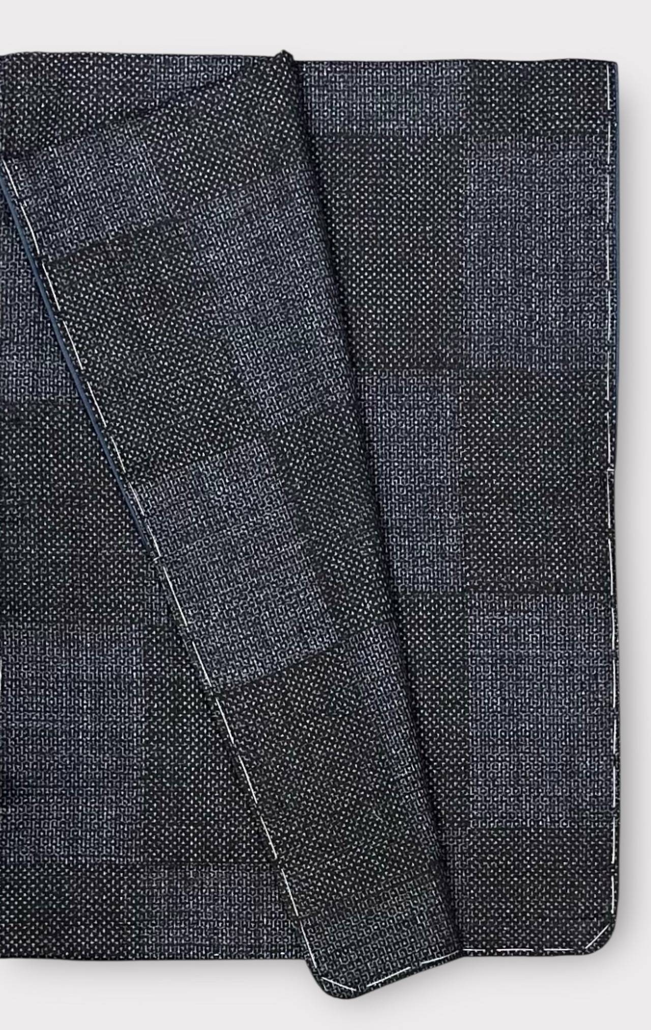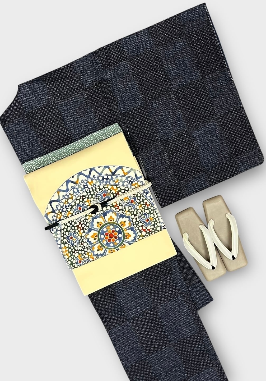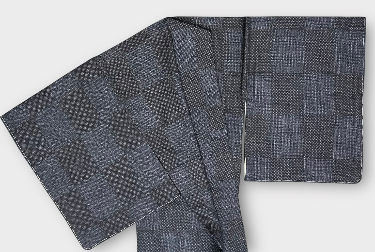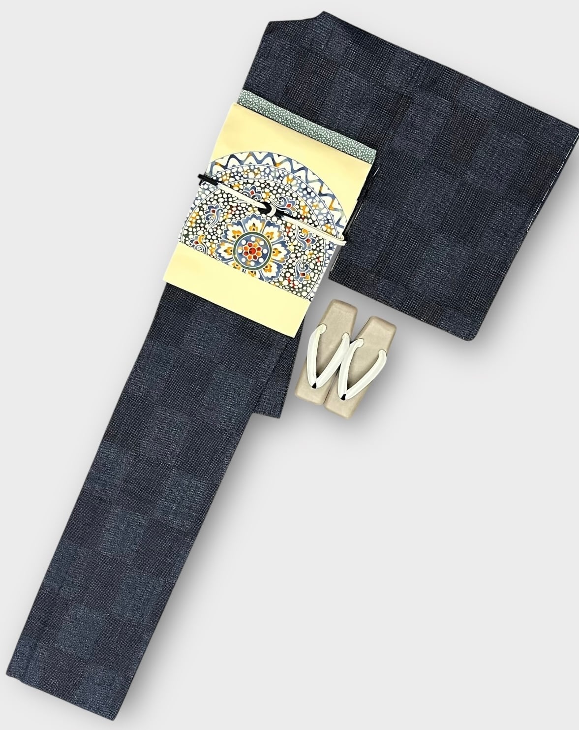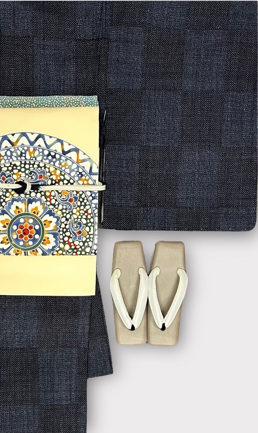 こちらは、藍色の濃淡の地に細かい亀甲柄と市松模様が施され、ほっこりとした温かみのある雰囲気を醸し出してる、美しい結城紬です。程よいハリ感があり、着心地も抜群です。しつけ糸つき。