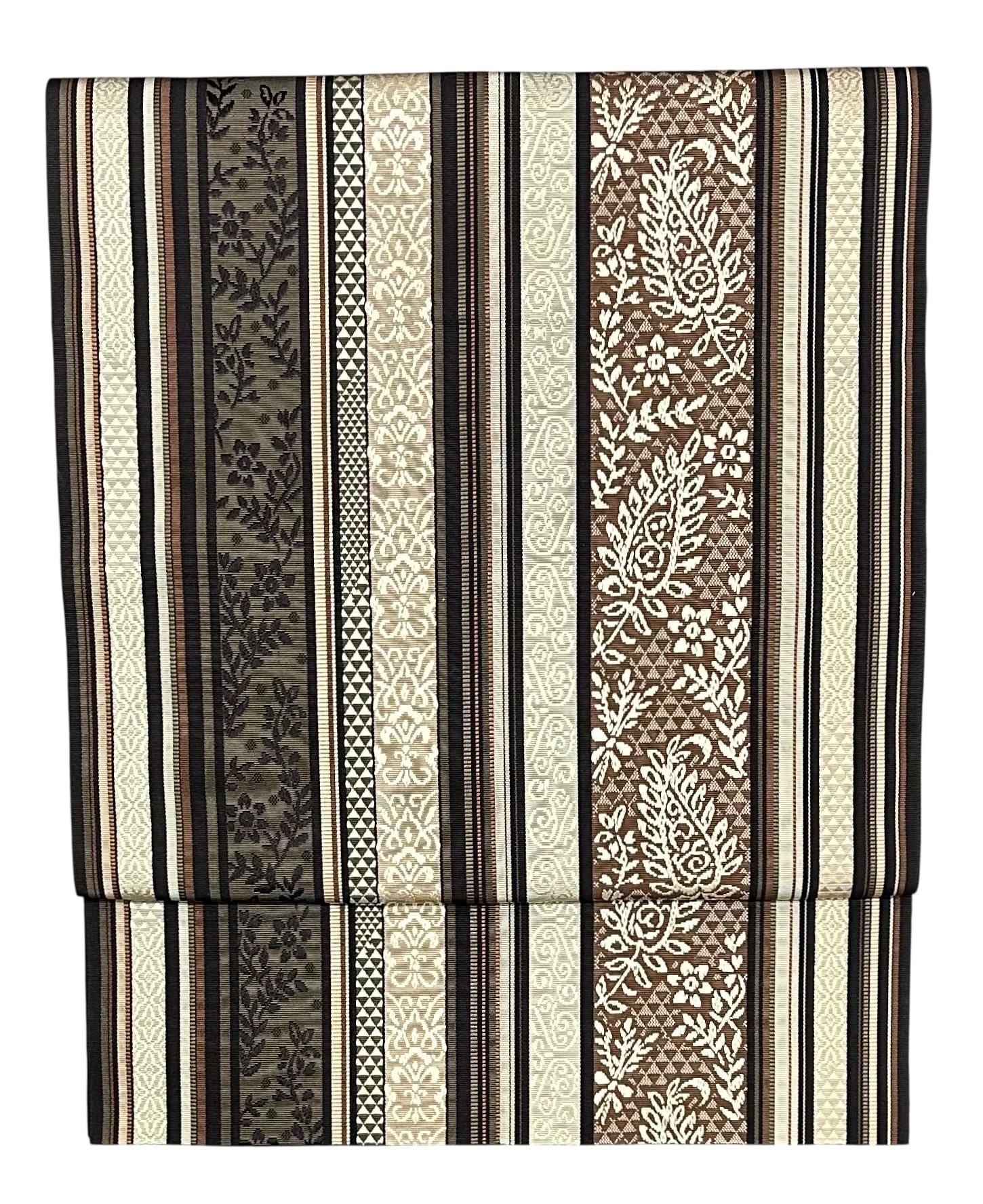 八寸名古屋帯 博多 黒地 江戸鼠色 蕎麦切色 枯野色など 草花 鱗文 長さ 370.5㎝ Q5658