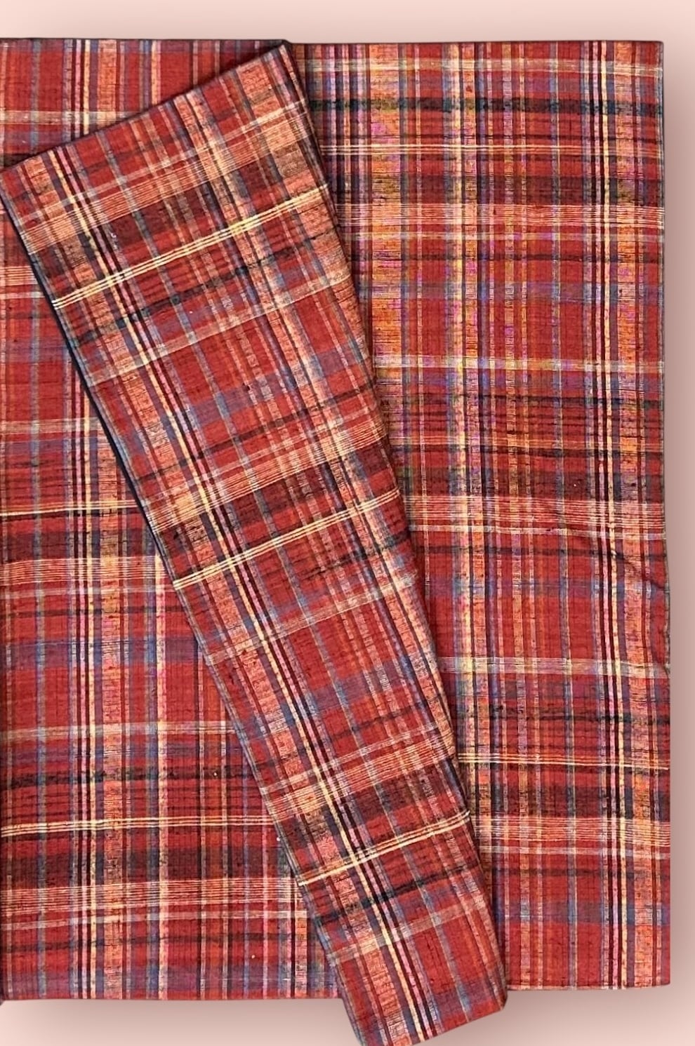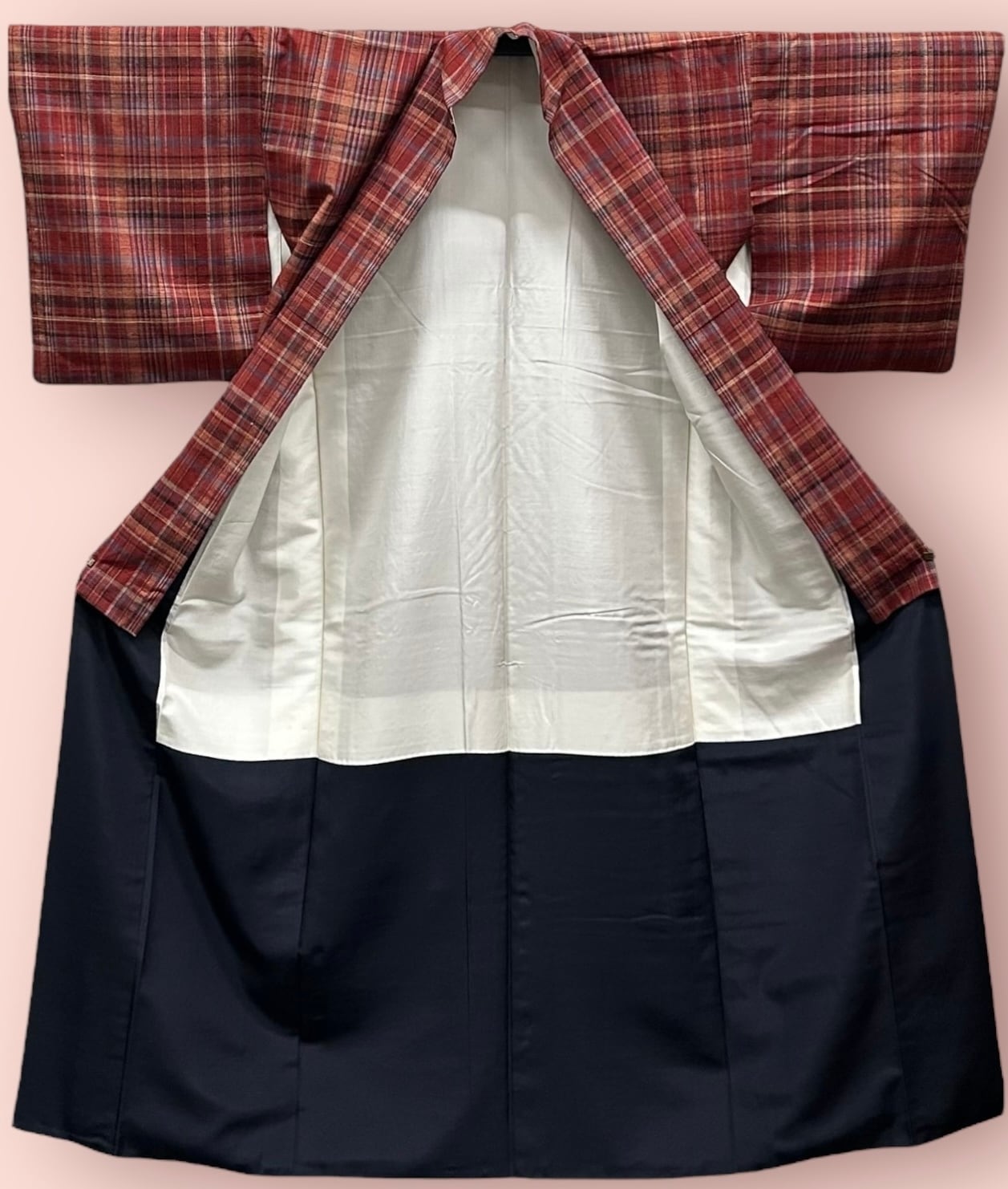 郡上紬 ゑり善 紅海老茶色 紺碧色 濃藍色 淡黄色などの素晴らしい織 裄丈 66.5㎝ K5681