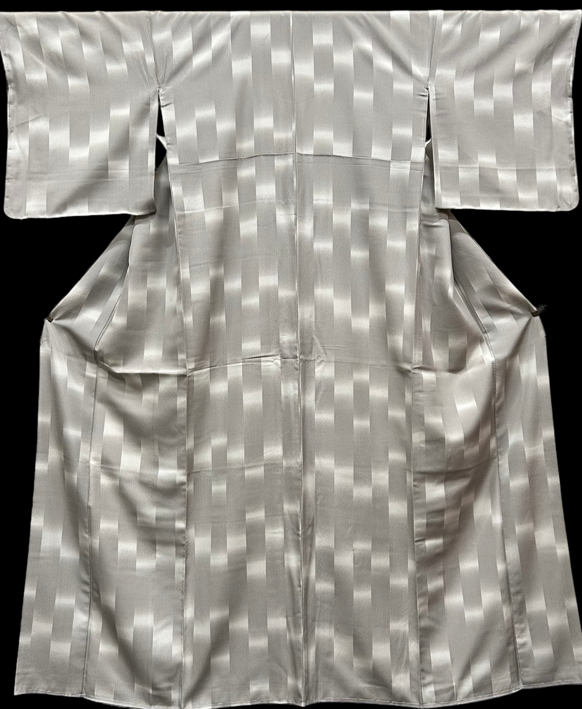 こちらは、洗練された小紋のお着物です。霞色の暈しが美しく、太い縦縞と細かい縦縞が施されたデザインは、見る人に優雅で落ち着いた印象を与えます。ちりめん地でハリがあり、さっぱりとした肌触りが特別な瞬間を演出します! しつけ糸つき。