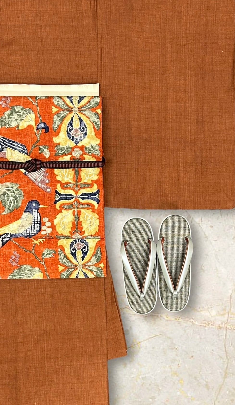 こちらは、鳥や草花の美しい型染めが施された名古屋帯です。落ち着いた樺色の地に、藍色や薄い支子色、木賊色が織りなす優雅な模様は、どんな着物にも品格を添える一品です!程よいハリのあるちりめん地が、しっかりとした存在感を放ちます。