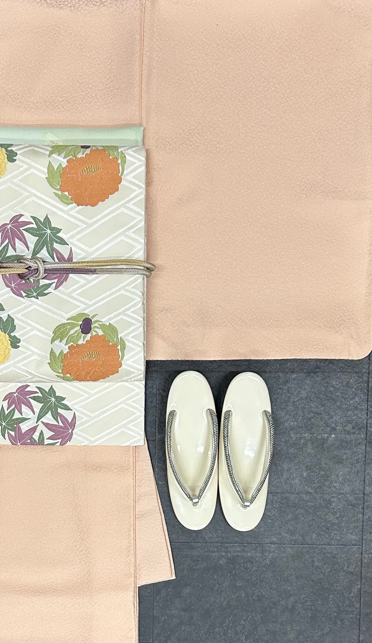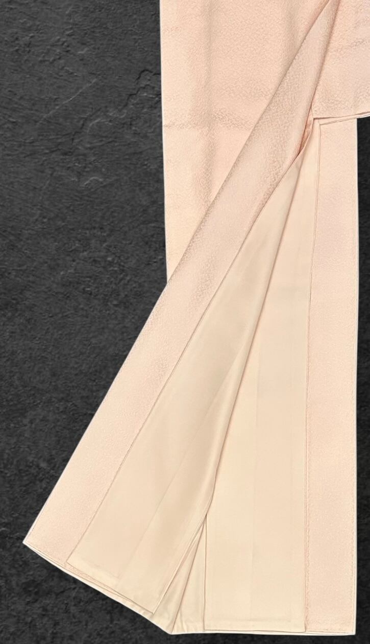 こちらは、繊細な地紋が魅力の草木染の色無地のお着物です。ピンクがかった水柿色は、光が当たることで浮かび上がる美しい凹凸感が特徴で、上品な印象を与えます!ハリ感のある生地は、さっぱりとした肌触りで、着心地の良さも魅力です。