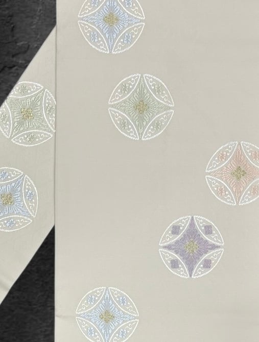 こちらは、名古屋帯の象牙色 七宝の丸紋の美しい一品です。立涌のような地紋に、白や薄い虹色、水色、夏虫色の七宝の丸紋が施され、上品ながらも華やかさを演出しています!ハリのある生地は、さっぱりとした肌触りで、着心地も非常に良いです。西陣の佐々木染織(株)の証紙もご用意されており、信頼性の高い品です。