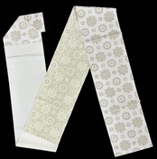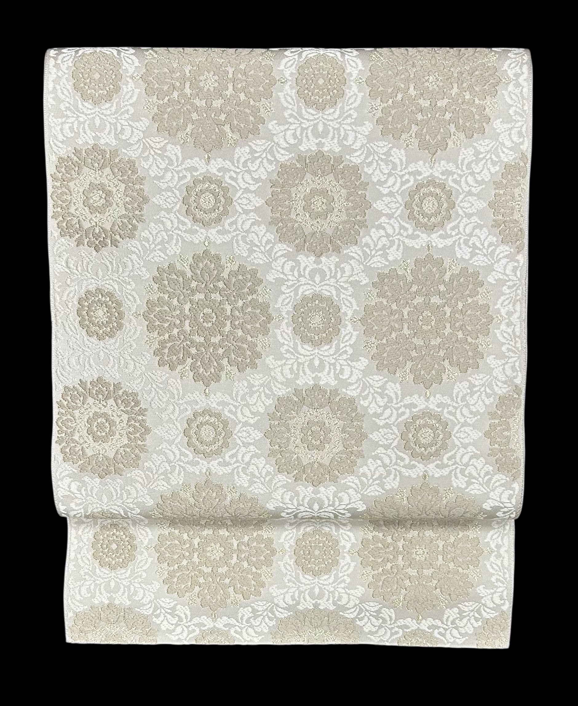 八寸名古屋帯 灰白色の地 豪華で清楚な大小の華文 松葉仕立て 長さ 375.5㎝ Q5662