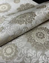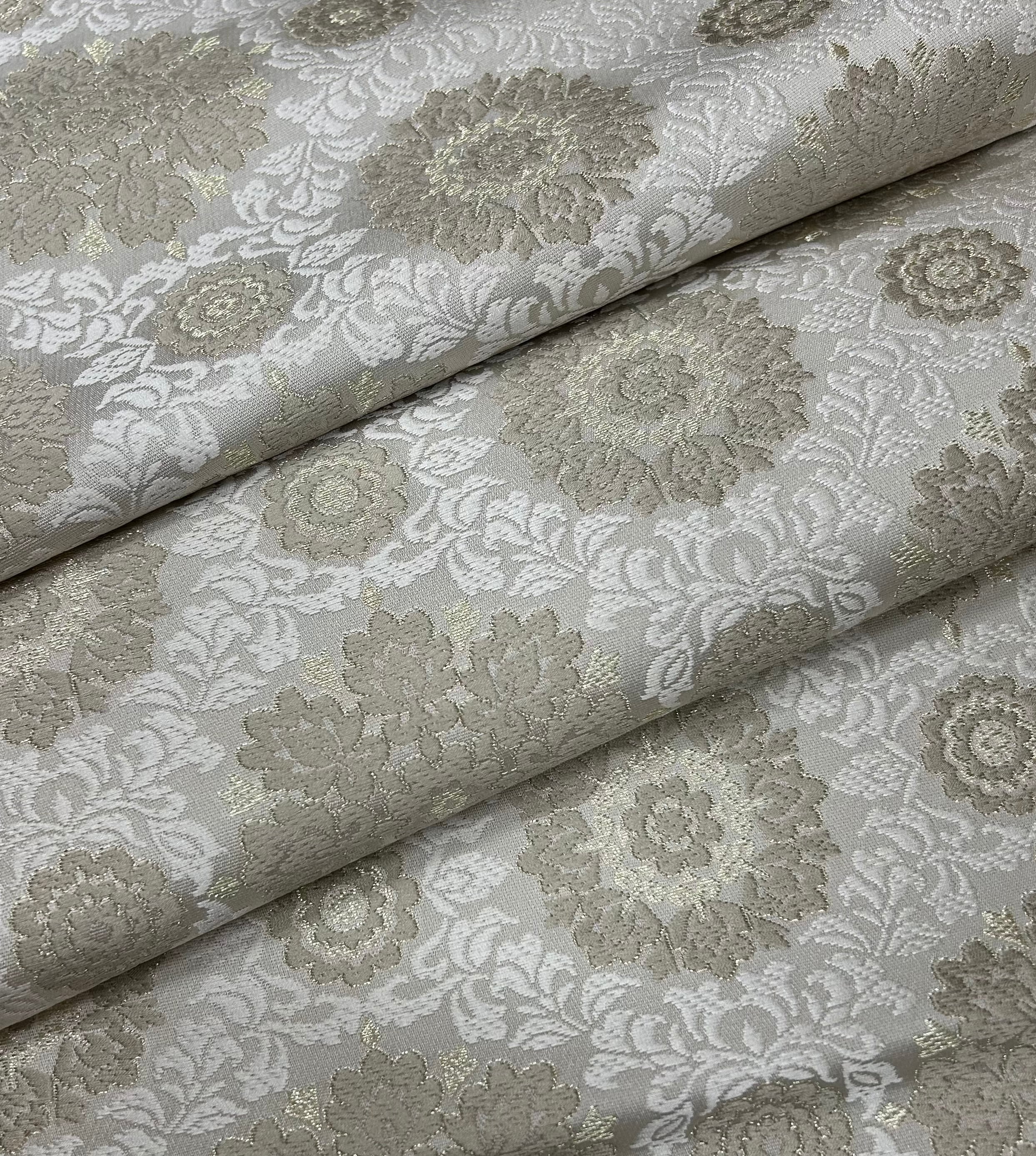 優雅さと清楚さを兼ね備えた 松葉仕立て 八寸名古屋帯をご用意いたしました。灰白色の地に、象牙色や砂色、薄めの金糸を使用した同系色の大小の華文が織り込まれ、薄手で柔らかめの生地感が、上品さを一層引き立てています。特別なお出かけや、日常の装いにもふさわしい逸品です!