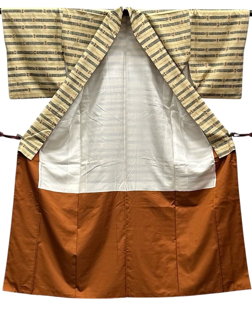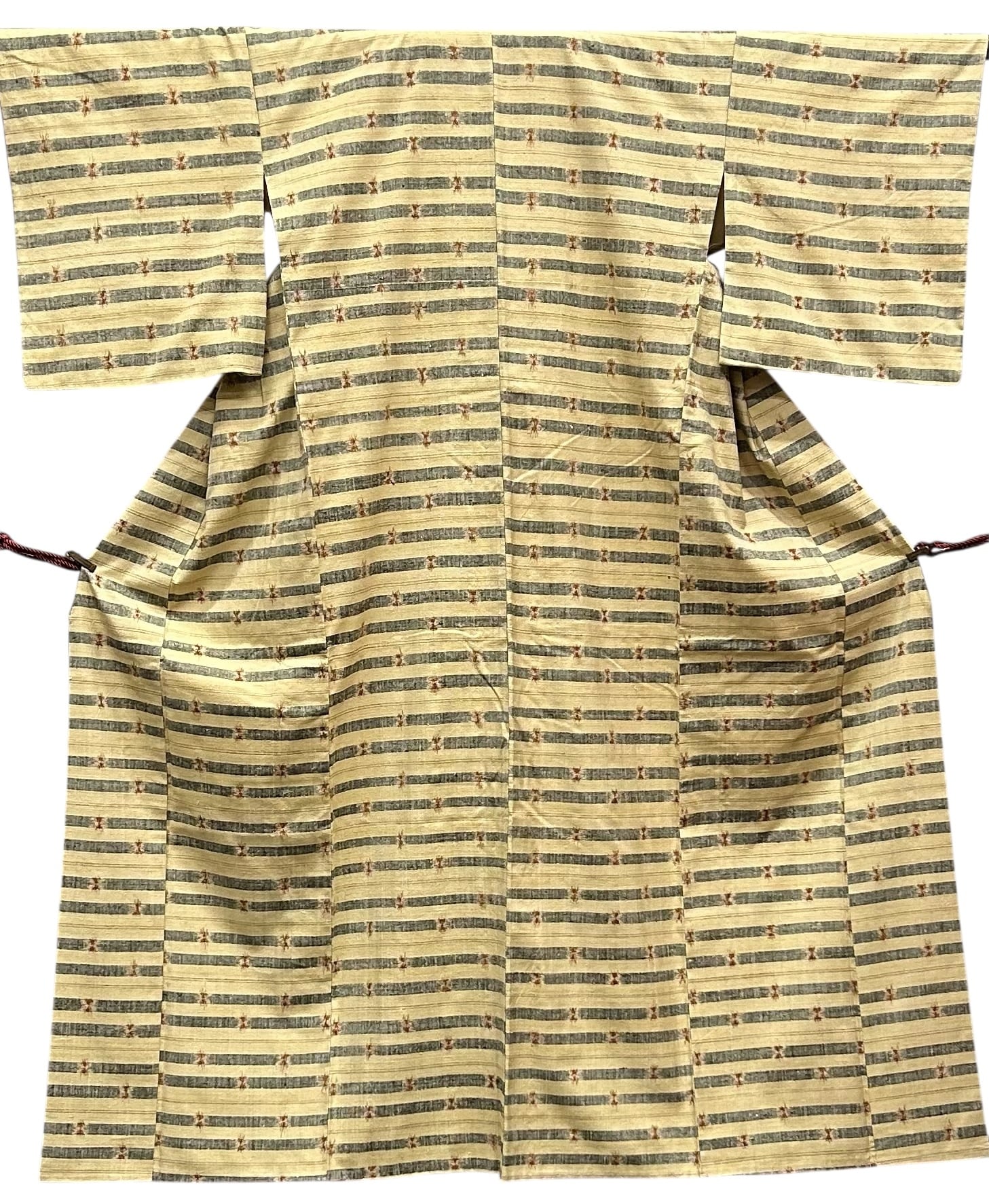 紬 高島屋 少し茶色がかった浅黄色×黒の横段 褐色などの細い線ポイント柄 裄丈67.5 ㎝ K4923