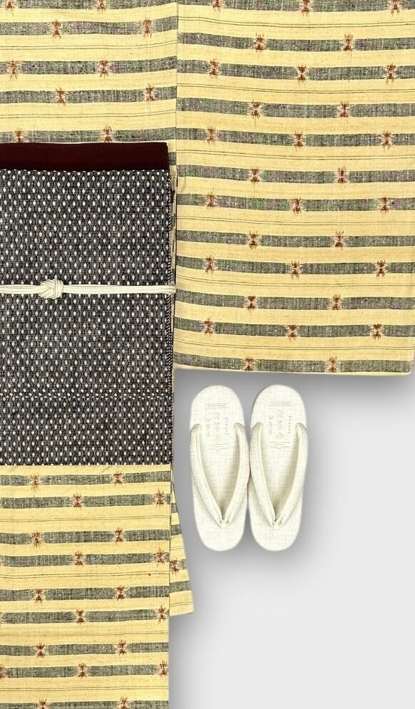 優雅さと温かみを持ち合わせた、高島屋さんの紬のお着物をお届けいたします。少し茶色がかった浅黄色と黒を織り交ぜた横段が美しいデザインで、所々に施された褐色の細い線やポイント柄が民芸調の趣を感じさせます。着用するごとに柔らかく身体になじんでくるような質感で大変味のある紬です。