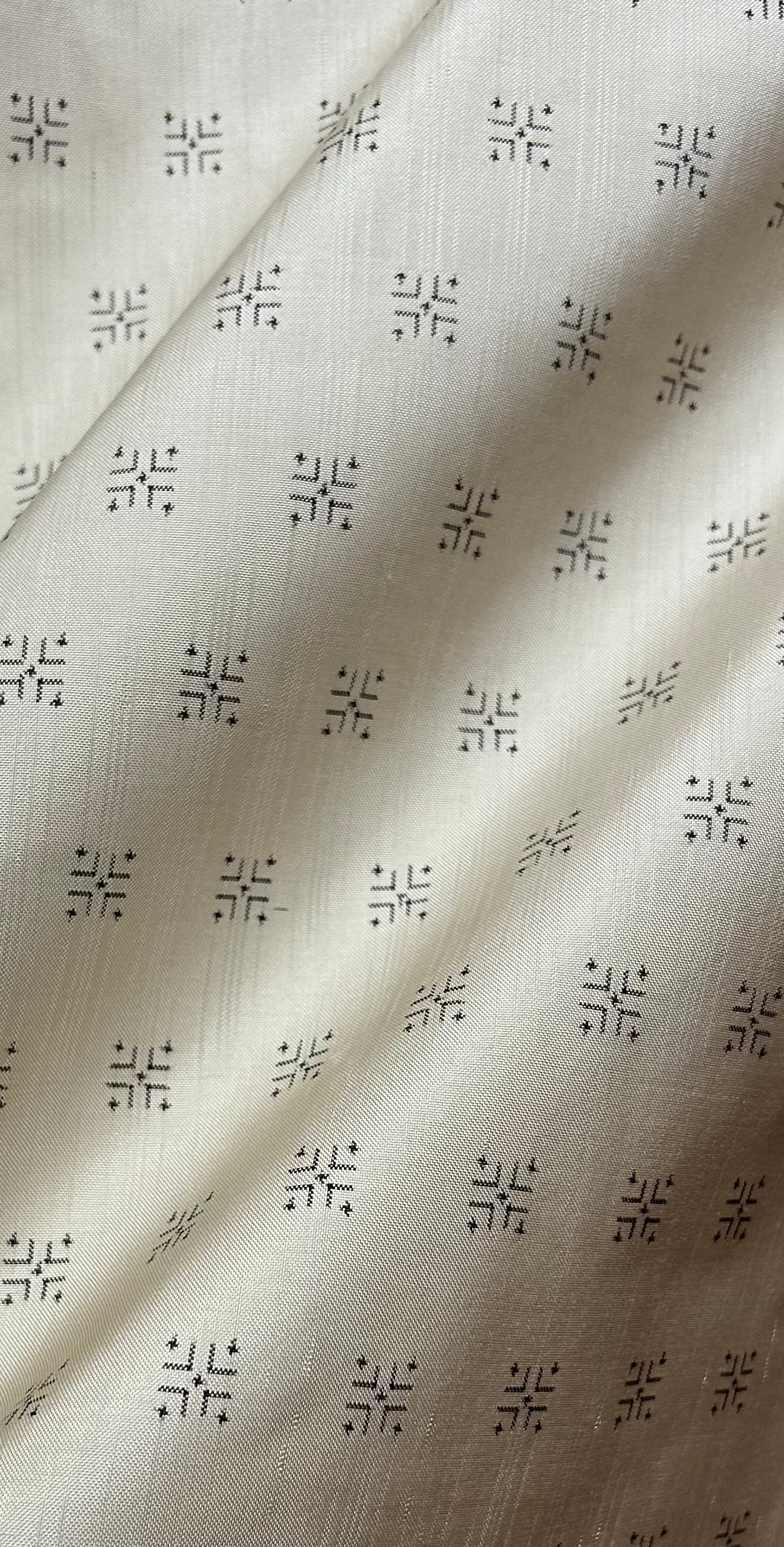 優雅で洗練された美しさを持つ、白大島のお着物をご提案いたします。薄い砥粉色を基調に、規則的に並んだ憲法色の細かい幾何学模様が描かれ、上品さを演出しています。しっかりとしたハリ感が特徴です。仕付け糸つき・ガード加工済み。