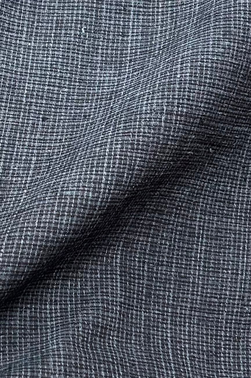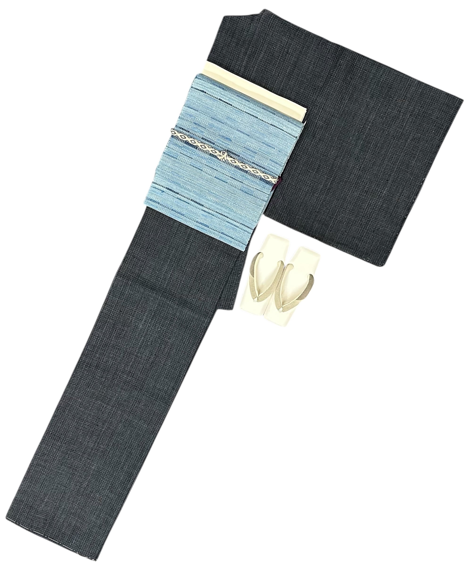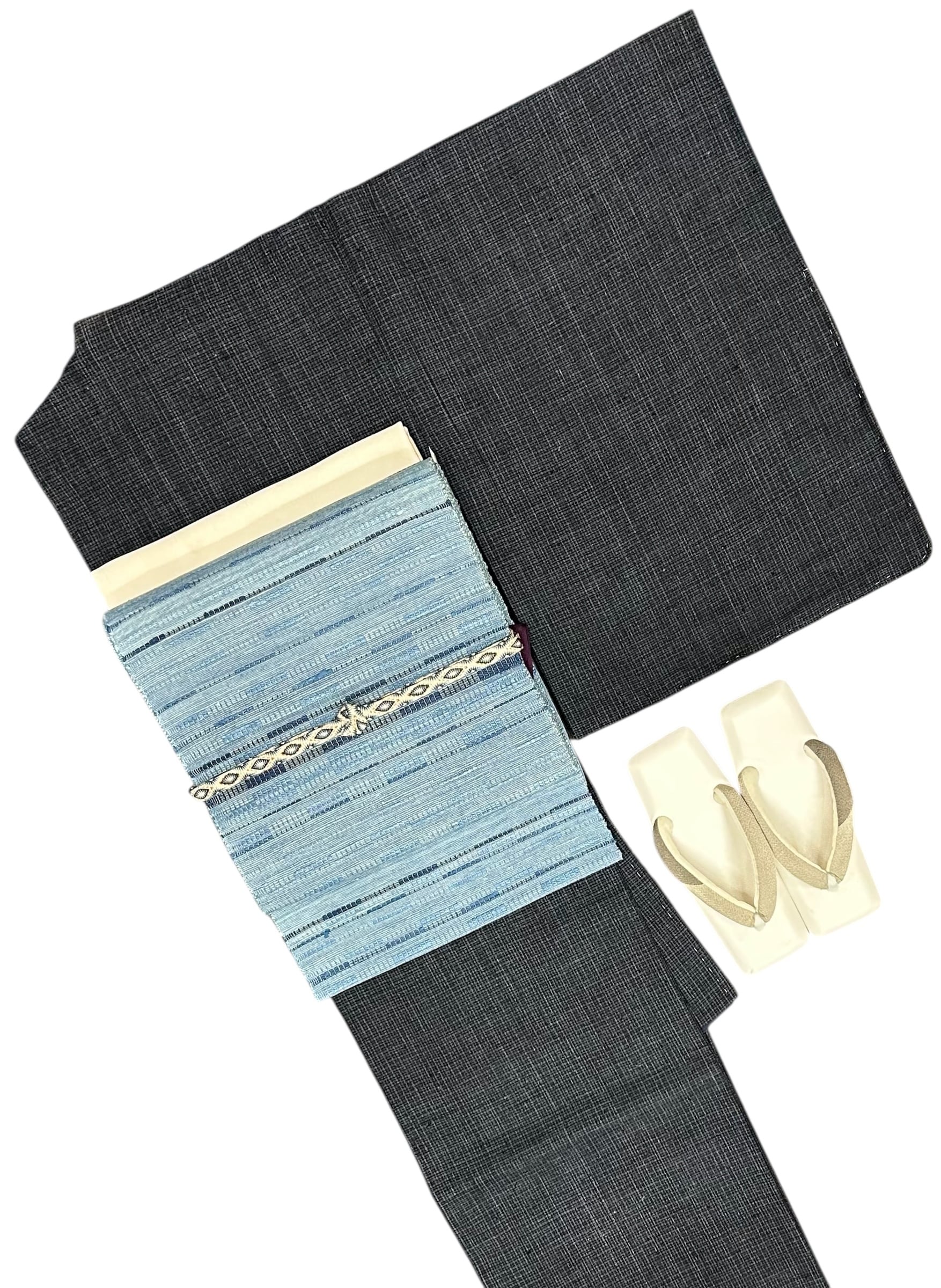 フシのある太めの黒に近い濃藍系と舛花色のが織り成す紬のお着物、細かい格子のような模様がシンプルながら味わい深い印象を与えています。薄めの地にハリ感と、柔らかさも感じられます。しつけけ糸つき。